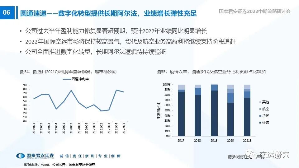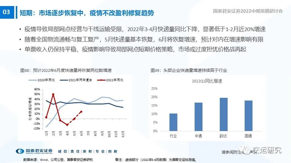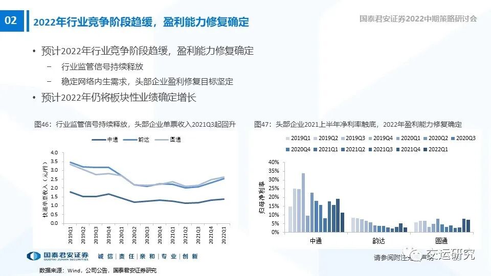 2022年行业竞争阶段趋缓,盈利能力修复确定。近期市场恢复有望催化业绩增长确定性的乐观预期,维持增持。增持评级:中通快递、圆通速递、韵达股份。受益标的:顺丰控股。