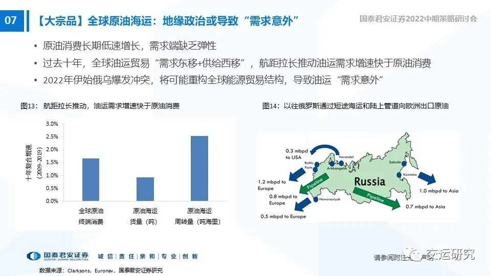 过去两年供需寻底,未来两年将逐步改善,自2021年底推荐。俄乌冲突提供“需求意外”期权,市场预期先行。受益标的:中远海能、招商轮船。