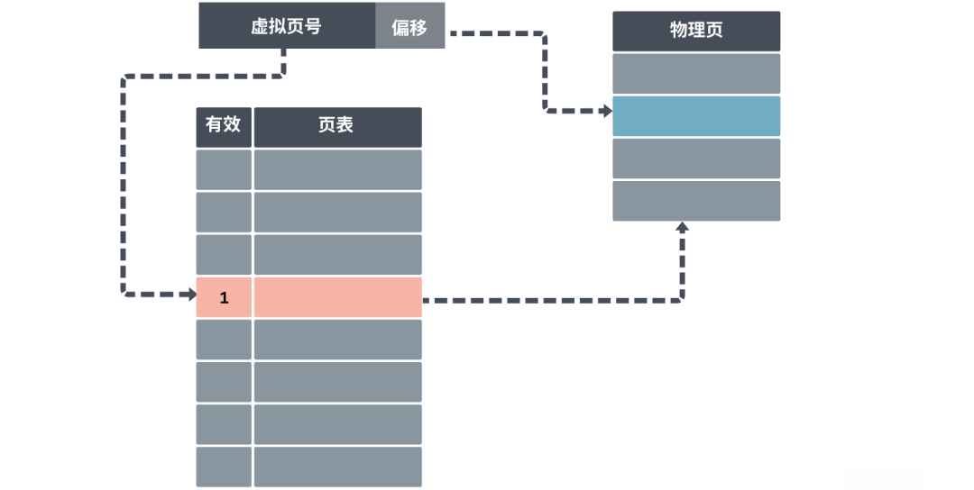 查找方式和上面说的组相联类似,首先使用虚拟页号作为索引去页表中找到对应的物理页号,页表中还会有1位表示有效位,如果该位无效就不在主存中,发生一次缺页;如果有效,那么就可以拿到对应的物理页号获取到对应的物理页位置,再根据偏移量得到物理内存地址。