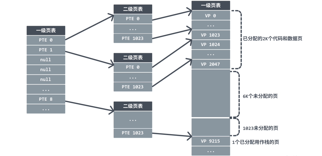这种方法从两个方面减少了内存占用。第一,如果一级页表中的一个 PTE 是空的,那么相应的二级页表就根本不会存在。由于很多程序占用内存实际远小于页表所能表示的大小,所以可以节约很大空间的页表项资源;第二,只有一级页表才需要总是在主存中,二级页表会在需要的时候创建或销毁,只有最经常使用的二级页表才需要缓存在主存中,这就减少了主存的压力。