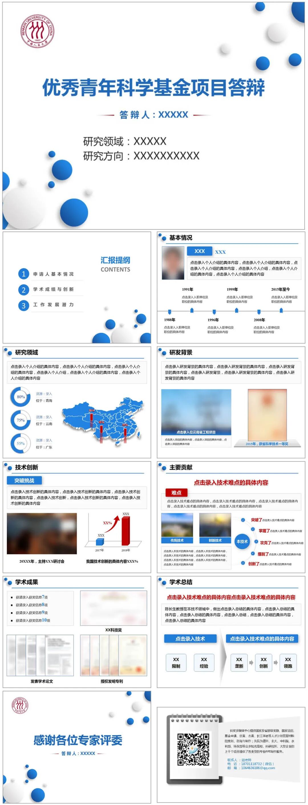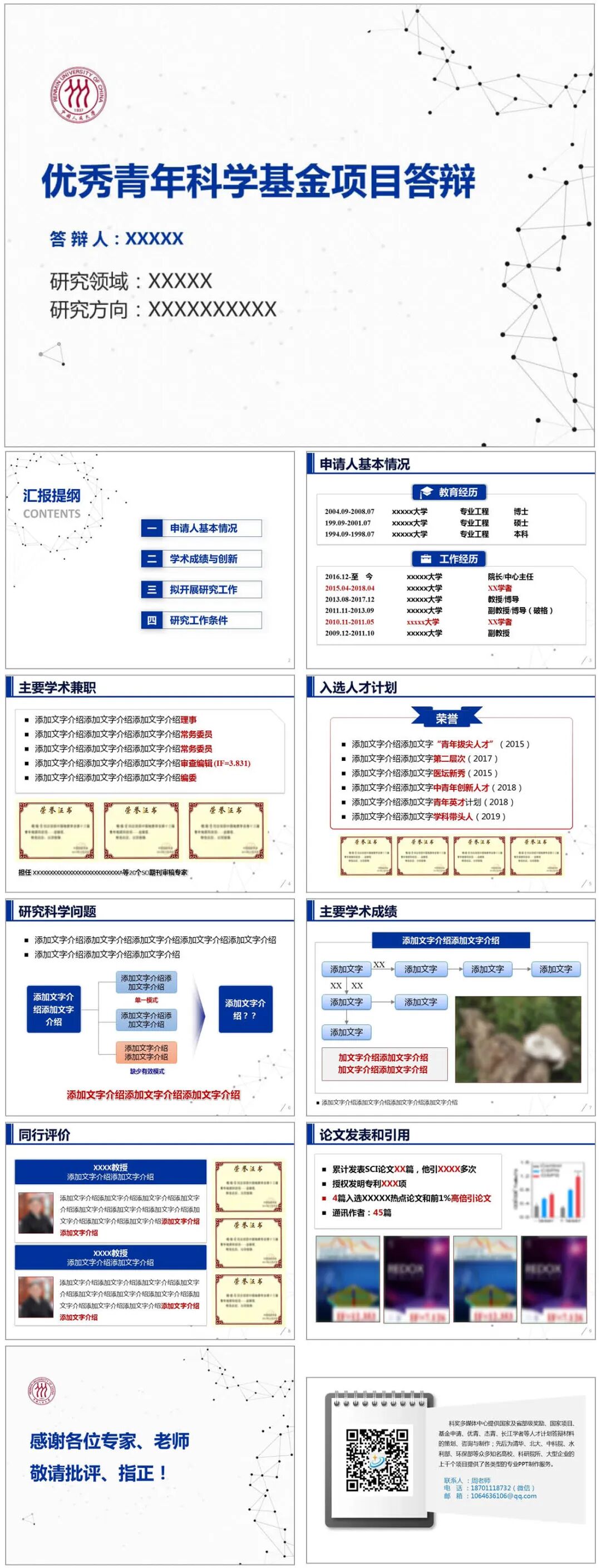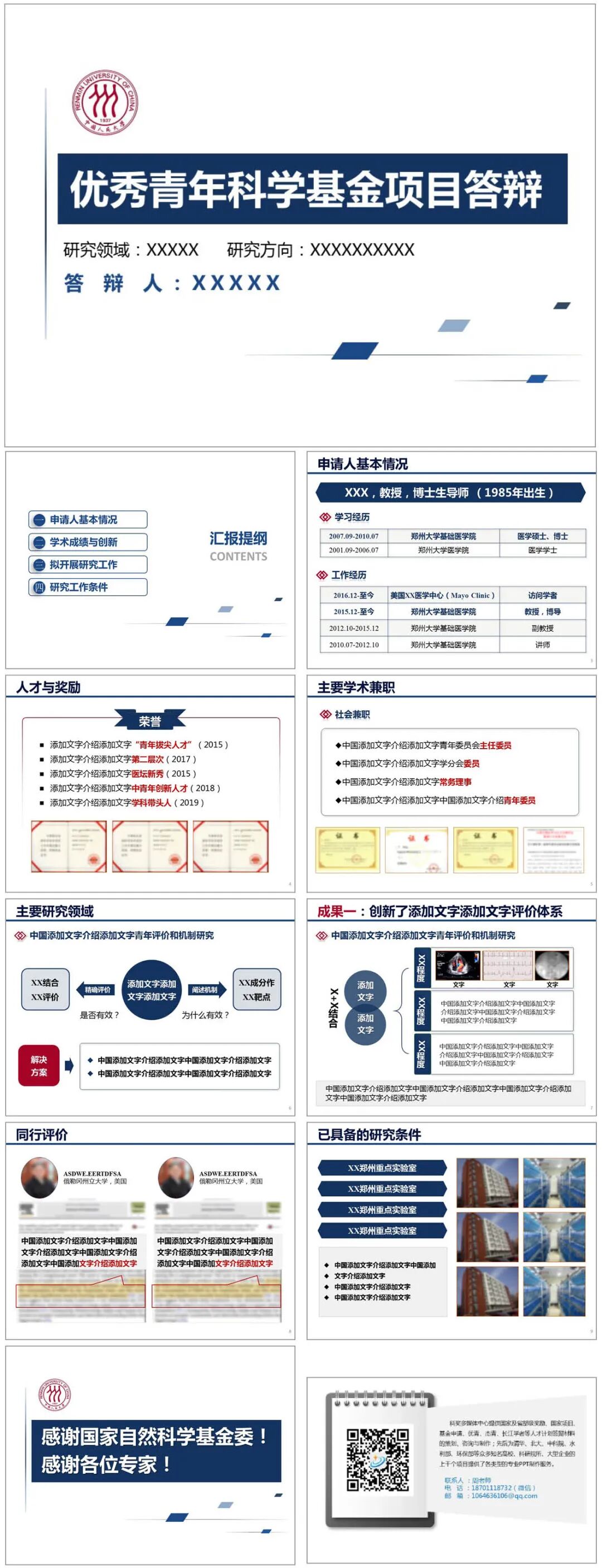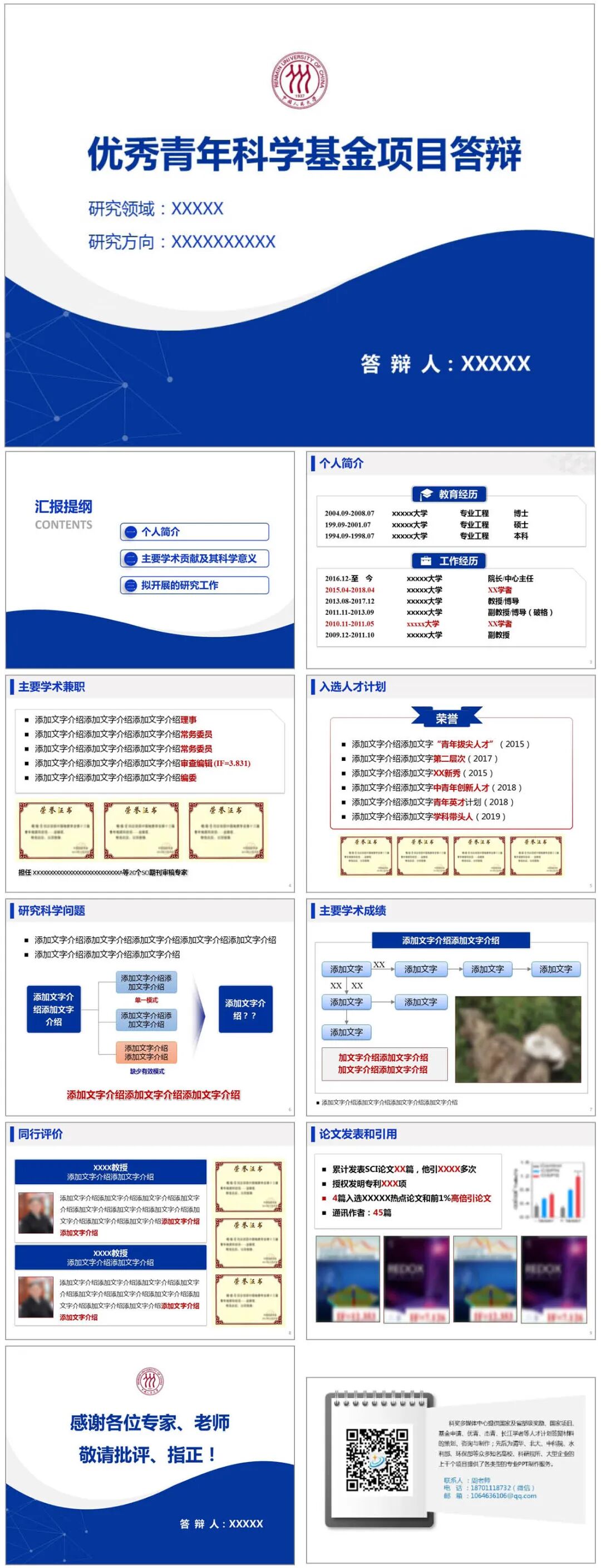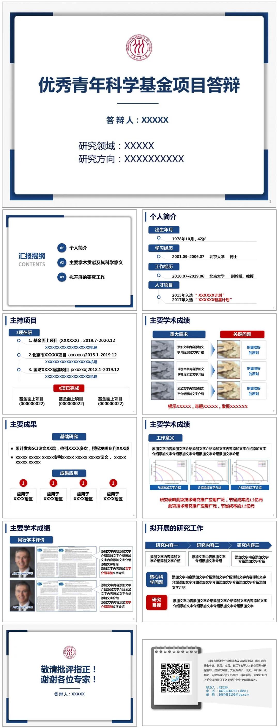 模板说明:本模板亮蓝色调,用于科学基金项目答辩,比较通用的学术模板,共10页,内容页面均按优青结构内容设计,全部内容可在PPT里自行修改。