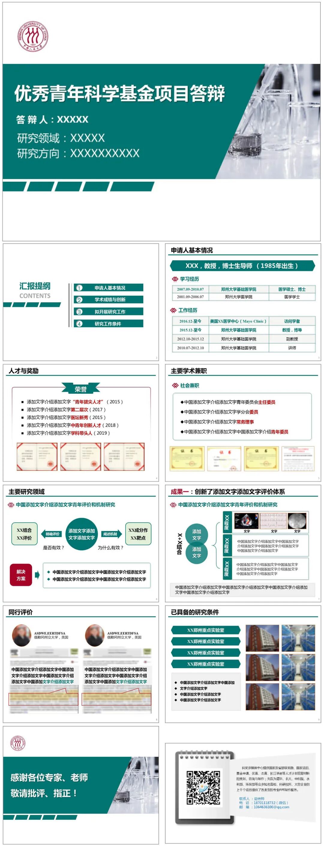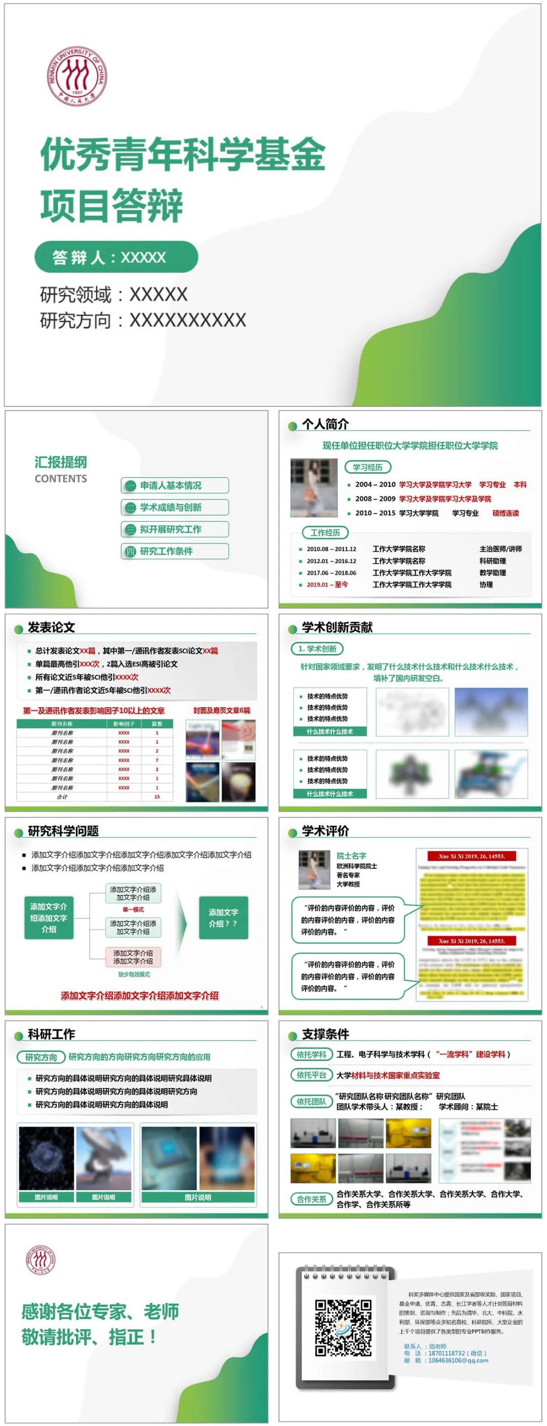模板说明:本模板绿色调,用于科学基金项目答辩,封面通用简洁,有创意,共10页,内容页面均按优青结构内容设计,全部内容可在PPT里自行修改。