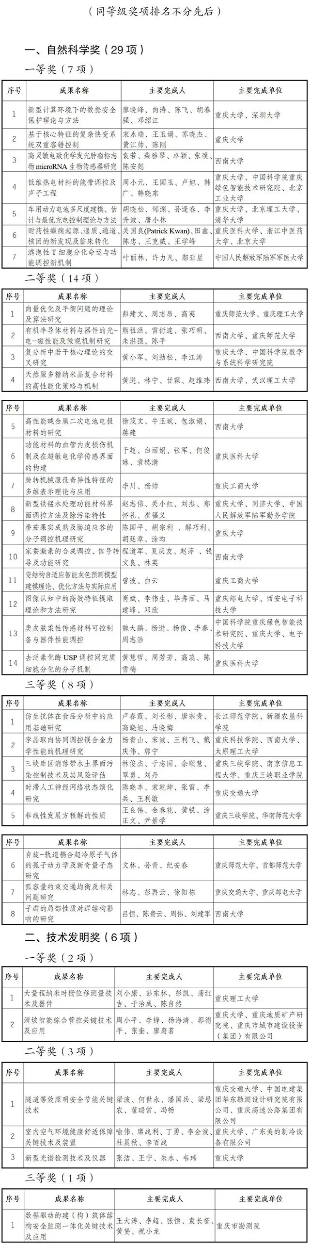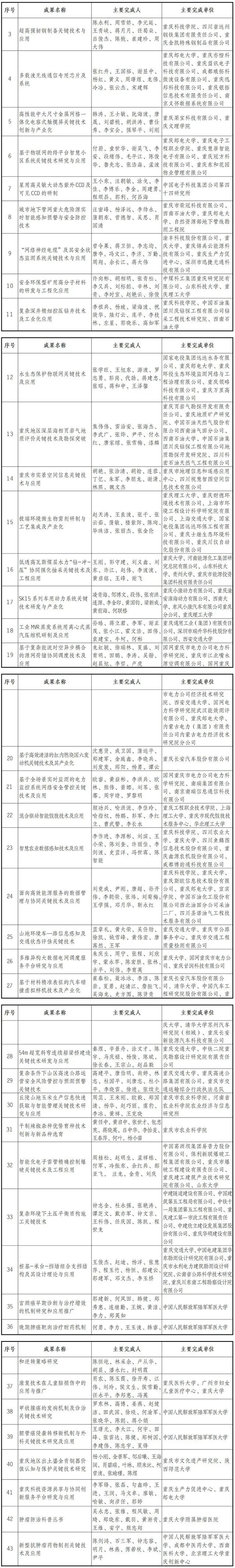 11月19日,重庆市科学技术奖励大会召开,2020年度重庆市科学技术奖揭晓。其中,150项成果获奖,包括自然科学奖29项,技术发明奖6项,科技进步奖115项;一等奖32项、二等奖60项、三等奖58项。3家企业获得企业技术创新奖。