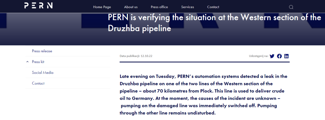 当地时间10月12日,波兰石油管道运营商PERN公司发表声明称,当地时间11日晚,检测到其“友谊”(Przyjaźń)石油管道西段的两条输油管线中,有一条出现泄漏。
