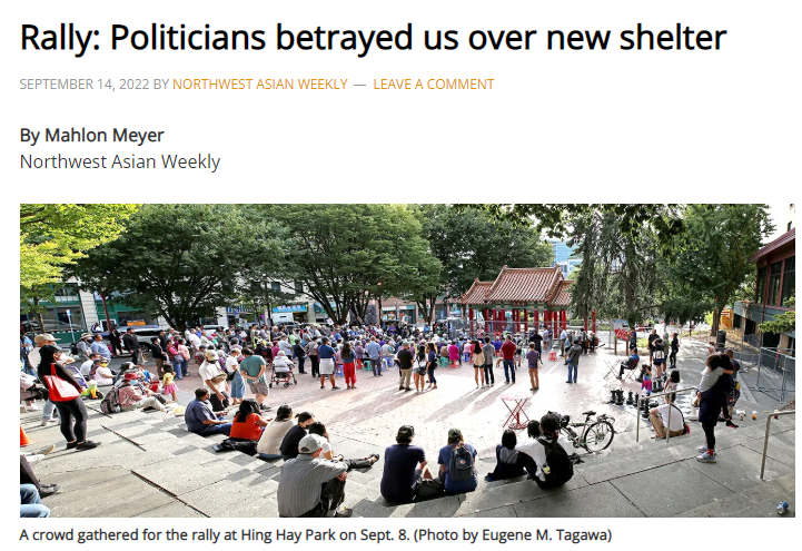 9月8日,一群人聚集在兴海公园(Hing Hay Park)参加集会。一个身穿深色皮夹克、留着光头、戴着眼镜的男子站在兴海公园的边上,打量着坐在广场上或举着牌子的100多个人。人们正在抗议西雅图市政府要在这里新建流浪汉收容所。