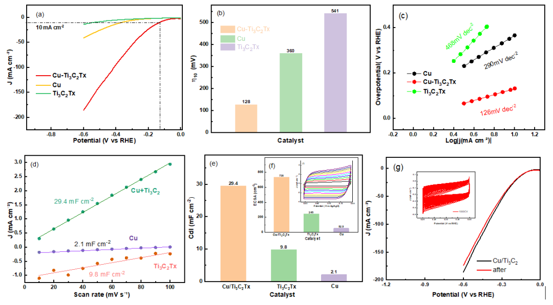 图 6. Cu/Ti3C2Tx 系列催化剂的电催化析氢反应性能。(a) 线性扫描伏安图;(b) 不同催化剂的过电位直方图;(c) 塔菲尔图;(d) Cdl 曲线;(e) Cdl 直方图;(f) ECSA的直方图;(g) Cu/Ti3C2Tx 稳定性测试图。