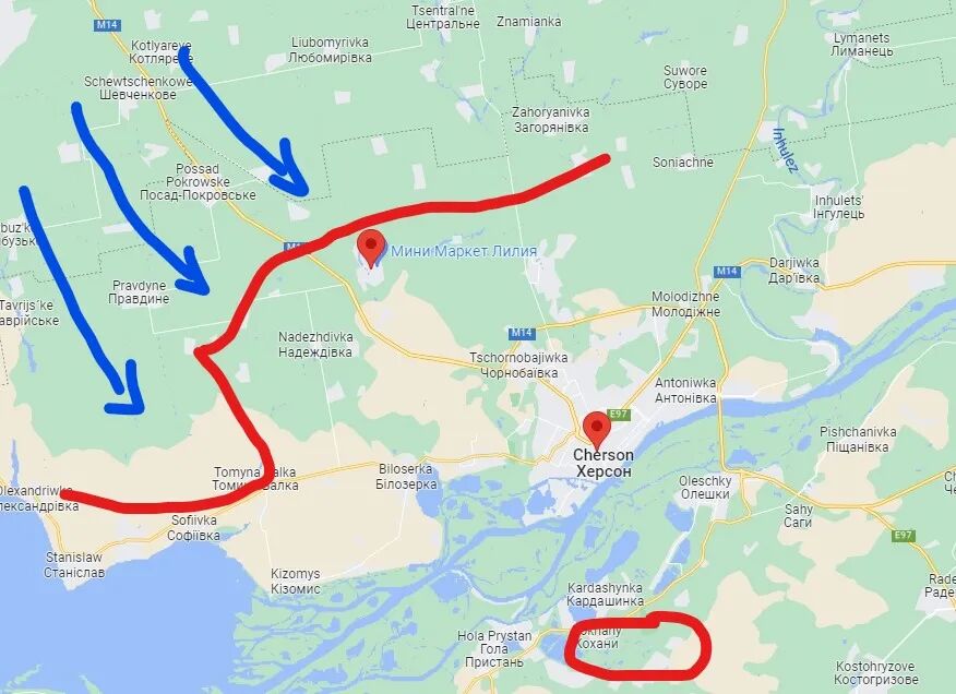 见上图我画的蓝色箭头为乌军进攻方向,红色线为俄军防御线。赫尔松下方的红圈,是乌军袭击俄军的地点。乌军在整个赫尔松前线出现多路突击的局面,北部乌军负责进攻北克里米亚运河区,南路进攻赫尔松城区。