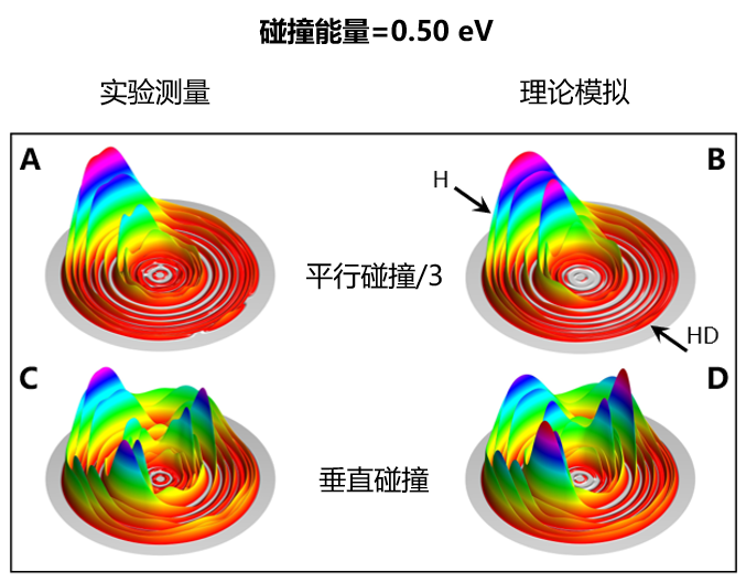 图二:在0.50 eV碰撞能下,两种不同的碰撞构型的H+HD→H2+H反应的微分反应截面差异非常明显(左列:通过交叉分子束实验测量得到;右列:通过量子动力学理论模拟得到)。图中不同圆环代表不同振转态的H2分子产物,圆环的高度代表在相应的散射方向上的H2分子产物的相对数量。