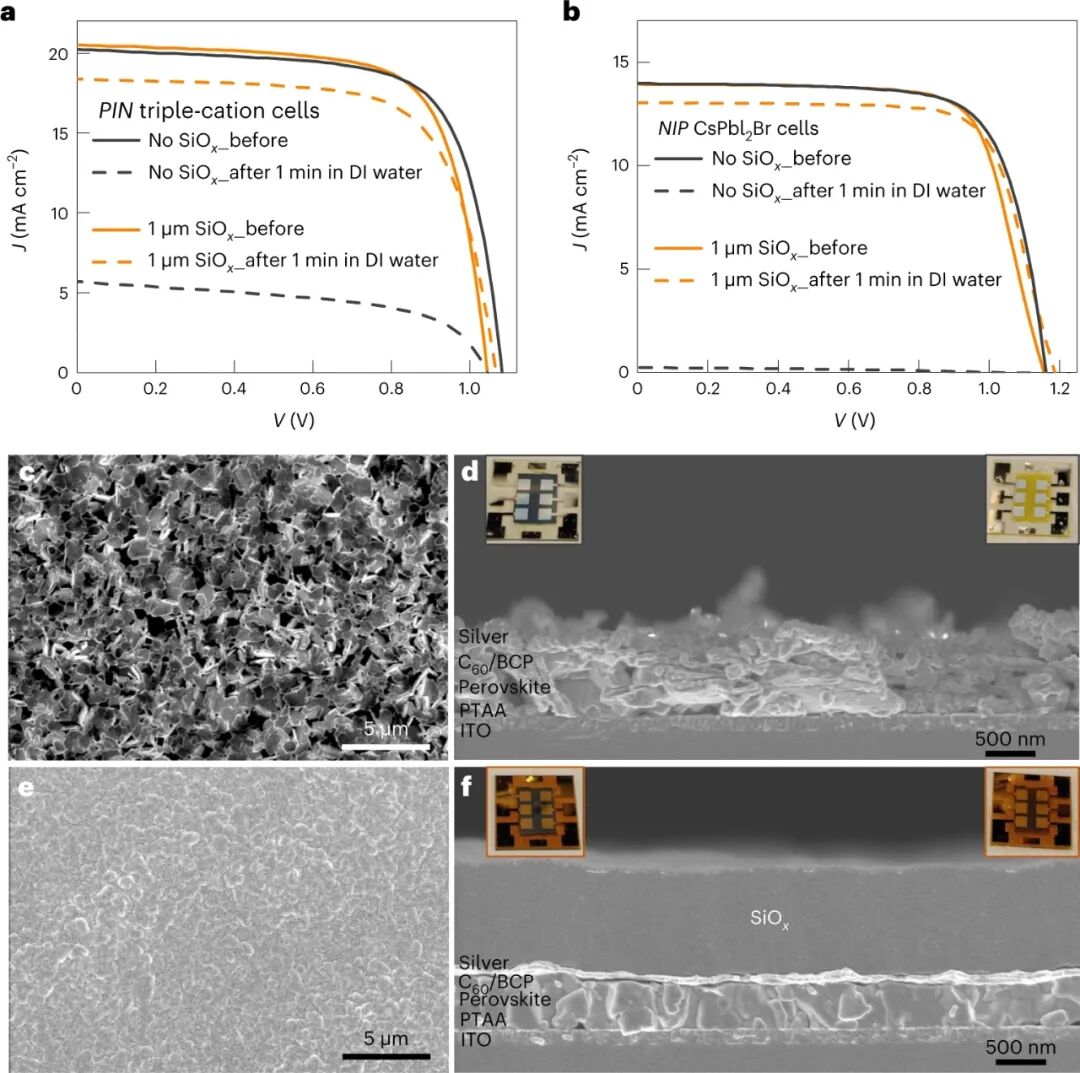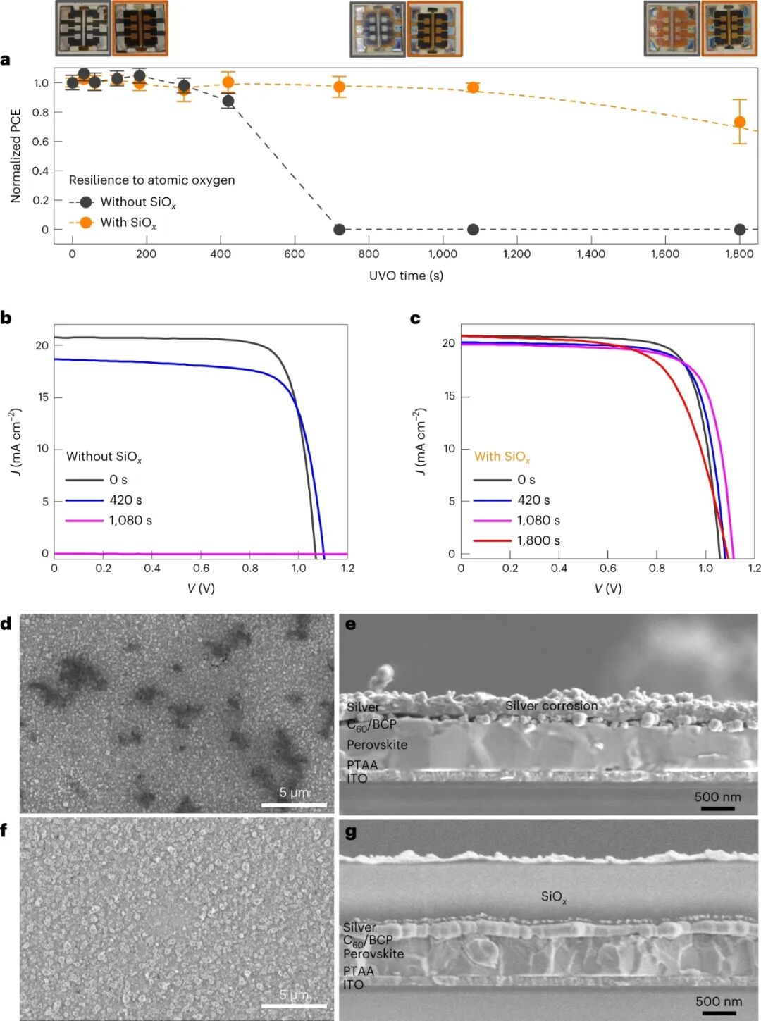近地空间的太阳能装机预计将在未来十年内成倍增长,从目前的几兆瓦1接近1吉瓦。随着空间互联网成为现实,诸如SpaceX的Starlink、亚马逊的Project Kuiper和英国政府的OneWeb等项目旨在向低地球轨道(LEO)发射总计约10万颗卫星。通过在高椭圆轨道上安装天基太阳能电池,从太空中利用太阳能并将其传送到地球上为电网供电的兴趣也在上升。这种对空间的快速渗透需要一种低成本、轻量级的太阳能发电技术,这种技术能够抵御电子产品在空间所面临的挑战,包括辐射、热循环、原子氧和高真空。钙钛矿半导体对陆地和空间应用都有很强吸引力。虽然地面条件要求耐用性,如潮湿和部分遮阳,但宇宙空间的应用则带来了不同的挑战:辐射、原子氧、真空和高温。本研究展示了一个氧化硅层,它能使钙钛矿光伏电池在关键的空间压力下变硬。在器件触点上蒸发的1微米厚的氧化硅层在1015 cm-2的通量下阻挡了0.05 MeV的质子,而没有损失功率转换效率,这使得器件在低地球轨道的寿命增加了20倍,在高椭圆轨道的寿命增加了30倍。氧化硅保护的Cs0.05(MA0.17FA0.83)0.95Pb(I0.83Br0.17)3(MA,甲基铵;FA,甲酰胺阳离子)和CsPbI2Br电池在水和N,N-二甲基甲酰胺的浸泡下正常存在。此外,Sn-Pb和CsPbI2Br器件的耐湿性得到了提高。该器件还被发现在暴露于阿尔法辐照和原子氧时依然能够保持功率转换效率。这种屏障技术是向空间和地面应用的轻质包装设计迈出的重要一步。1、本研究首先使用SRIM/TRIM软件模拟了0.05 MeV质子与钙钛矿太阳能电池的相互作用,该软件是一个蒙特卡洛模拟,模拟了离子通过物质的过程,考虑了通过非电离核位移和电子电离的能量损失。本研究考虑了由标准电荷传输层和基于Cs0.05(MA0.17FA0.83)0.95Pb(I0.83Br0.17)3(三阳离子)的钙钛矿活性层组成的n-i-p和p-i-n器件结构。图1a,b显示了100,000个质子通过n-i-p结构的发生和随后的穿越情况(质子交错),有/无1微米覆盖的SiOx的顶层。2、本研究通过热蒸发在n-i-p和p-i-n太阳能电池上沉积了1微米的SiOx,并用0.05 MeV的质子照射它们(图1c,d)。SiOx的沉积并没有对设备造成任何损害,这一点从不变的PCEs(约18.5%)中可以看出。3、质子辐照对活性表面积为0.1 cm-2的钙钛矿太阳能电池的PCE的影响显示在图1e,g中,代表性的J-V曲线显示在图1f,h。没有SiOx的器件表示为“bare”,有SiOx的器件表示为“protected”。辐照后的电池的PCE与辐照前的初始PCE之比(即PCE剩余系数)表示为r。裸露的太阳能电池在以1013cm-2的通量辐照时损失了约15%的初始PCE,1015 cm-2的质子破坏了这些设备,使效率降至零。受保护的电池对这些通量表现出显著的弹性,这与SRIM/TRIM模拟的理论见解一致。1、原子氧、α-粒子和紫外线辐射是空间环境中的主要压力源。然而,迄今为止,大部分都没有在钙钛矿太阳能电池中进行测试。本研究通过对太阳能电池进行UVO处理,模拟了原子氧和紫外线照射的影响。在操作过程中,UVO室产生波长范围为200纳米的紫外线光子,类似于低地轨道的紫外线环境。在与室中的大气分子氧相互作用时,这些光子产生原子氧,负责灰化经常用于清洁的表面有机物。图2a显示了带和不带SiOx屏障的p-i-n三阳离子太阳能电池的归一化PCE。裸露的设备(16.3%的PCE)在8分钟的UVO暴露后完全损坏,而受保护的设备即使在20分钟的暴露后仍保持其最初的PCE为17.0%。在图2a上行所示的照片中,可以看到一个有代表性的裸器件的变色。正如SEM所发现的,原子氧腐蚀了银电极。2、图2d,f分别显示了裸电池和受保护电池的金属电极区域的俯视SEM图像。裸电池(图2d)显示了明显的损伤,当对该装置的横截面进行成像时(图2e),这变得更加明显。3、受保护的器件没有发现明显的变化(图2f,g)。暴露30分钟后,观察到具有SiOx屏障的电池的PCE有轻微下降。这种性能下降可能是由于原子氧对SiOx的逐渐侵蚀造成的,在图2g中可以看到SiOx层顶部有白色的堆积。1、上述论证确定了SiOx能使钙钛矿太阳能电池对质子、α-粒子和原子氧进行硬化。本研究还探索了SiOx阻挡层是否在太空应用之外有更广泛的范围。以地面兼容性为目标,测试了SiOx保护的电池对极性溶剂的耐受性。图3显示了去离子水浸泡对p-i-n三阳离子和CsPbI2Br电池性能的影响。虽然太阳能电池板与水的直接互动并不是一个现实的场景,但这样的测试将耐湿性方面发挥到了极致。2、在这里,本研究再次发现,在去离子水浸泡一分钟后,SiOx覆盖的p-i-n三重阳离子和CsPbI2Br电池保留了其初始PCE的~90%(分别为15.0%和11.9%)。鉴于CsPbI2Br装置的内在不耐湿性,它的情况尤为突出。事实上,图3b中黑色虚线表示的初始PCE为11.7%的裸CsPbI2Br器件与水接触后完全损坏,而受保护的电池则保持了其棕色和性能。3、图3c,d的SEM图像说明了p-i-n三阳离子电池在浸水时的损坏程度。SiOx屏障阻止了电池与水的任何相互作用,使其没有被损坏(图3e,f)。1、正如SEM所证明的那样,SiOx层的显著形态均匀性也表明它有可能成为地面应用的湿气和化学屏障。为了说明这一点,本研究选择了两种对水分高度敏感的钙钛矿吸收剂化学。基于低带隙(1.25 eV)Sn-Pb吸收剂的太阳能电池通常在一个氮气手套箱内进行表征,因为将它们暴露在没有封装的环境中会导致降解。同样,基于宽带隙(1.88 eV)CsPbI2Br钙钛矿吸收体的太阳能电池对水分很敏感。虽然,这些化学制品对串联太阳能电池的设计很有希望,但它们对湿气的敏感性需要在工业上