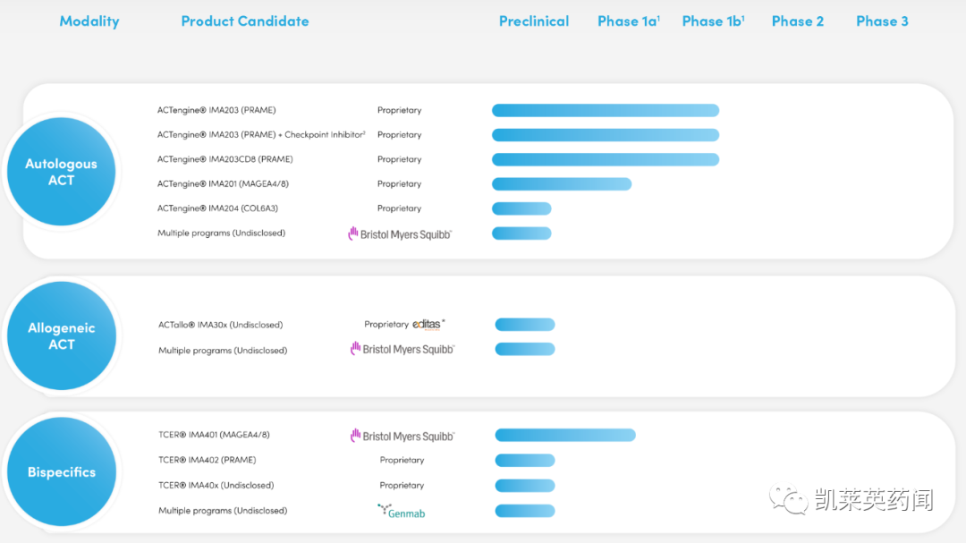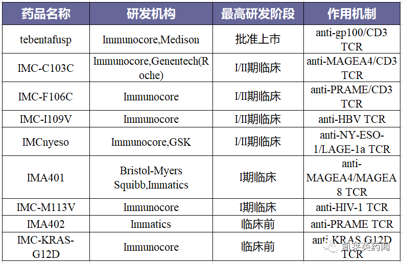 其中,TCR-T 是通过相应的实验技术,克隆能够特异性识别特定HLA- 肿瘤抗原肽复合物的TCR 后,将TCR 基因编码序列通过慢病毒等基因递送的方式递送至更多的T 细胞中,赋予这些T 细胞新的抗原识别特异性,从而有效地识别肿瘤细胞特异性的抗原,并特异性杀伤肿瘤细胞,发挥抗肿瘤活性。与CAR-T 疗法相比,二者的共同之处在于都是通过基因改造的手段提高T 细胞受体对特异性肿瘤细胞抗原的识别能力和进攻能力。相较于CAR-T,TCR-T的优势在于:(1)识别的靶点,来自胞膜、胞浆和胞核中蛋白的抗原肽,而CAR 只能识别原来就定位于细胞膜表面的抗原。(2)相较于CAR-T,TCR-T 更容易浸润到实体瘤内部,因此容易获得更好的抗肿瘤活性。(3)针对单个抗原靶点的TCR-T 回输后,可以进一步激活患者自身针对其他肿瘤抗原表位的T 细胞,具有逆转实体瘤抑制性免疫微环境的作用。(4)相对于CAR-T,目前TCR-T 的临床试验出现细胞因子风暴的频率较少,其严重程度较低,这可能与TCR-T 保留天然的受体结构和信号通路有关。然而,TCR 除了可以用于开发TCR-T之外,还可以用于开发蛋白药。TCR蛋白药相较于TCR-T的优势在于:首先,自体TCR-T往往成本高昂,制备复杂,并且部分患者不适宜单采,导致这一方法可及性较差。另一方面,对于一些适应症比如慢性感染,TCR-T也并不适用,可能会在回输后大量扩增,迅速杀伤肝脏细胞,导致爆发性肝衰竭。第三,TCR蛋白药在成本、生产、可及性、PK特性、安全性方面都更具有优势,并且能够应用到更多疾病领域。除此以外,一些公司也正在开发TCR的抗体形式,以TCR-mimic抗体为例,它模拟了TCR识别MHC-I呈递抗原肽的能力,但在识别靶点时容易发生偏转。进行TCR 发现和亲和力优化的技术难度非常大,改建和筛选一个亲和力优化的TCR 比获得一个亲和力优化的抗体更为困难。国内外布局TCR-T 研发的企业数量有限,能够开展TCR 蛋白药开发的企业更为稀少。下面我们国内外的TCR创新药的开发情况进行简单的分析。1、据不完全统计,目前在研的TCR创新药中,主要以TCR-T为主,研究数量近百余种,其中最高的研发阶段处于临床II期,多数处于临床前的研究阶段;其余包括蛋白药在内的药物仅十余种,其中tebentafusp是全球首款也是唯一一款获批的TCR双特异性蛋白。2、在研究企业上,领先TCR-T企业包括TCR2 Therapeutics、可瑞生物、TScan Therapeutics、Adaptimmune Therapeutics、Kite等;在TCR蛋白药研发上,英国Immunocore 公司和德国Immatics 公司布局的药物最多。3、将TCR-T等细胞疗法排除,目前在研的TCR创新药统计如下:Tebentafusp是第一个获得监管批准的带有 TCR 的药物,它是一种双特异性蛋白,由亲和增强的T细胞受体与抗CD3效应因子融合组成,可将T细胞重定向为靶向糖蛋白100阳性细胞。2022年2月,tebentafusp经FDA批准用于治疗不可手术或转移性侵袭性眼癌患者。该适应症的获批是基于一项开放性、3期试验,将既往未接受过治疗的HLA-A*02:01阳性的转移性葡萄膜黑色素瘤患者以2:1的比例随机分配接受tebentafusp、或研究者选择的单药帕博利珠单抗、伊匹木单抗或达卡巴嗪治疗。研究的主要终点是总生存期。结果显示:tebentafusp组1年时的总生存率为73%,对照组为59%;tebentafusp组的无进展生存率也显著高于对照组。在不良反应上,最常见的治疗相关不良事件是细胞因子相关事件(由T细胞活化引起)和皮肤相关事件(由糖蛋白100阳性黑素细胞引起),包括皮疹(83%)、发热(76%)和瘙痒(69%)。这些不良事件的发生率和严重程度在前3次或4次给药后降低,很少导致试验治疗中止(2%)。未报告治疗相关死亡。IMC-C103C是一种基于Immunocore专有的ImmTAC技术平台,开发的一种新型的双特异性蛋白,通过TCR结合结构域合抗CD3 T细胞组装结构域,同时靶向MAGE-A4,使T细胞重新定位以杀伤表达MAGE-A4的肿瘤细胞。2021年12月,在ESMO免疫肿瘤学大会上报告的1期试验数据显示,在一些卵巢癌和头颈癌患者中,IMC-C103C药物活性迹象令人鼓舞。2018年,基因泰克(Genentech)斥资1亿美元,与Immunocore共同开发IMC-C103C。IMA401是一款靶向MAGEA8/MAGEA4的TCR双特异性药物,该药物其中一个结合区域靶向MAGEA4/8,另一个区域接合并激活T细胞。目前,IMA401已在各种体内肿瘤模型(包括患者来源的异种移植模型)中表现出完全缓解。2021年12月,百时美施贵宝(BMS)宣布斥资9.2亿美元,包括一笔1.5亿美元的预付款,以及高达7.7亿美元的开发、监管、商业里程碑付款,收购Immatics旗下IMA401的全球独家权益,以扩充其肿瘤治疗管线。Immunocore是一家总部位于英国的晚期生物技术公司,核心技术是基于TCR改造的ImmTAX平台。该平台将人工改造后亲和力(pM水平)增强的天然TCR与效应子片段(nM水平亲和力)偶联成双特异性的ImmTAX分子,通过改变效应子片段驱动特定的免疫反应从而具备治疗广谱性疾病的能力。例如对于肿瘤或者传染病将效应子片段设计成抗CD3的单链抗体片段(scFv)用于募集、激活T细胞增强免疫反应,而对于自身免疫病则设计免疫抑制作用的效应子片段。(1)靶标范围远远大于目前批准的仅局限于细胞表面靶点的抗体靶向疗法;(3)克服了肿瘤微环境中免疫细胞数量不足或某些肿瘤低免疫原性的问题。(4)利用在健康细胞上不表达或最低水平表达的靶点蛋白,减少或者避免肿瘤免疫疗法中免疫耐受的问题。(5)相比于其他抗体或细胞疗法,ImmTAC不需要预处理可即刻治疗攻击肿瘤。目前,利用该平台,Immunocore在肿瘤、感染性疾病和自