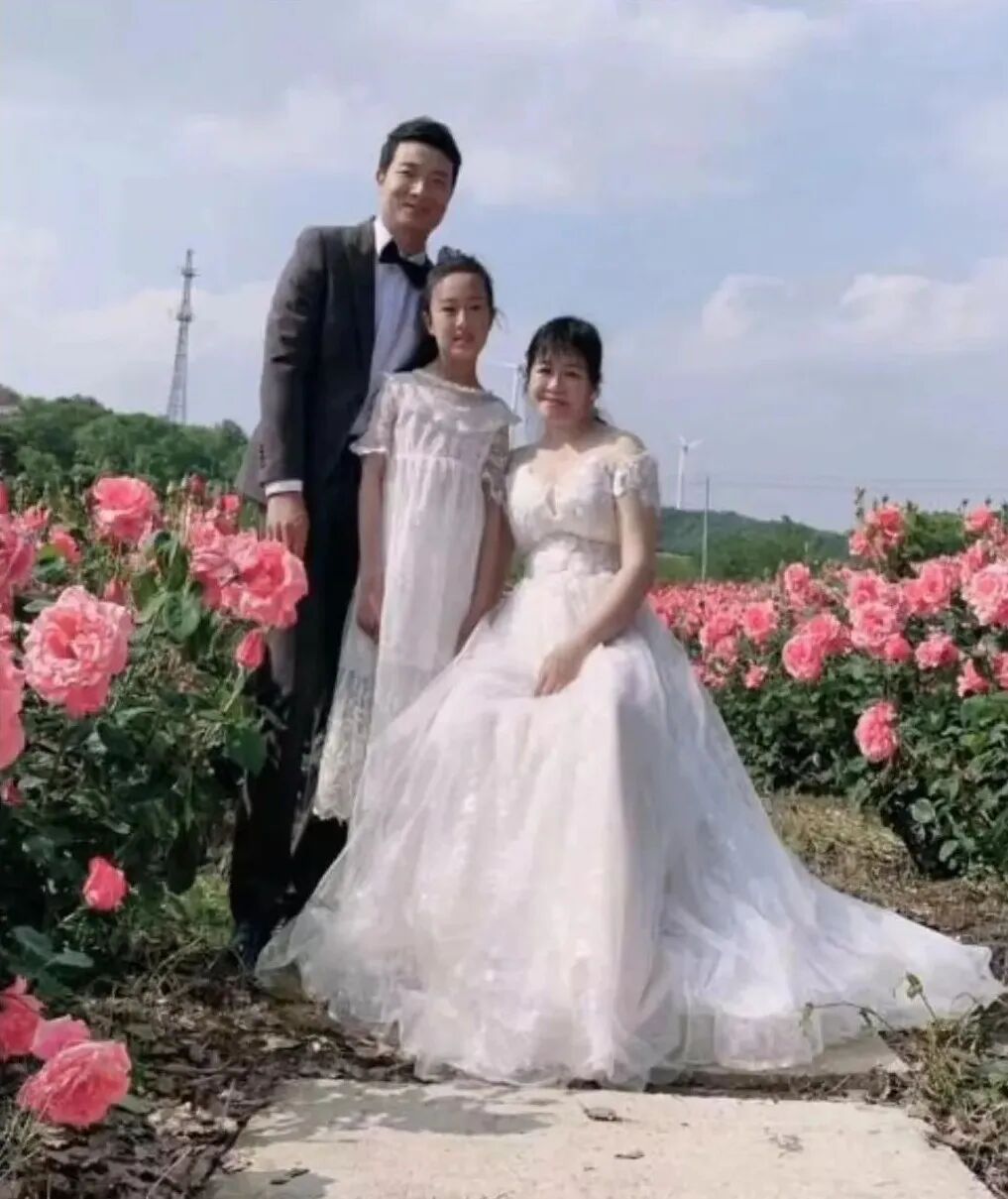 我看那婚纱照,新娘很有心,把C位留给继女,很搭。全家福新人中间夹着小姑娘左右两边立着两家父母,多么和美。都说恋爱是两个人的事,缔结良缘可是两个家族的大事。这拍婚纱照了,下一步是不是走上红地毯入洞房呢?嗯,看着好般配。都说女人披上婚纱是一生中最美的时光,你看白色的婚纱映衬着余老师娇羞的粉红小脸,美极了。我注意到了,诗人的眼镜拿掉了,含情脉脉的眸子足够水汪深情。