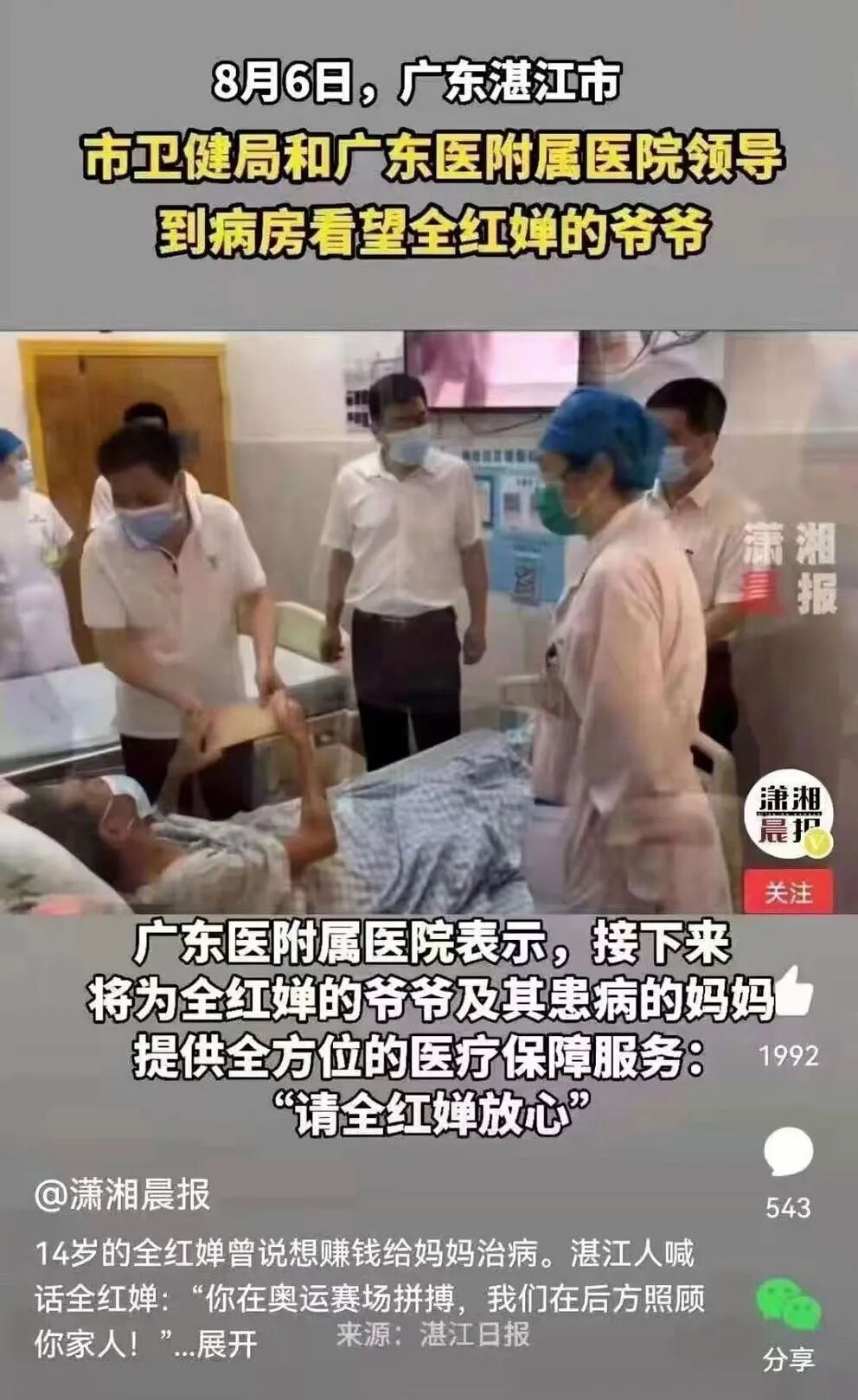 医院领导当场表示,接下来全红婵妈妈和爷爷看病会得到医院全方位的保障,请奥运会冠军放心。