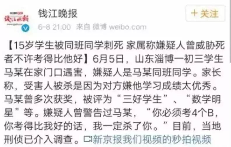 据新闻报道,受害者被杀,是因为凶手嫌他学习成绩太优秀,并威胁他不许考得比自己好。