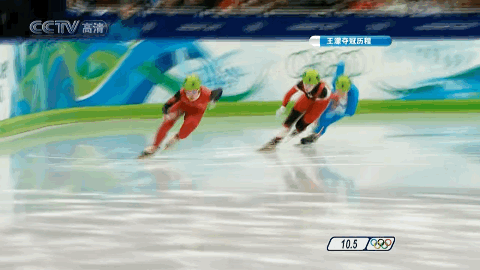 还剩四圈时,王濛才如梦初醒,小脚一蹬,就从外圈窜到了第一。