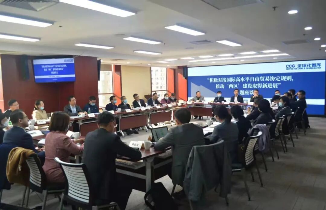 2022年3月31日,北京市政协与全球化智库(CCG)在CCG北京总部举行“积极对接国际高水平自由贸易协定规则,推动‘两区’建设取得新进展”专题座谈会。来自北京市政协、高校、智库及企业界的代表围绕贸易投资便利化、电子商务、跨境服务贸易、知识产权保护等主题展开探讨。与会嘉宾就推动“两区”重点领域经贸规则对接先行先试的方向和政策建议进行交流,以期推动规则制度创新。![]()
