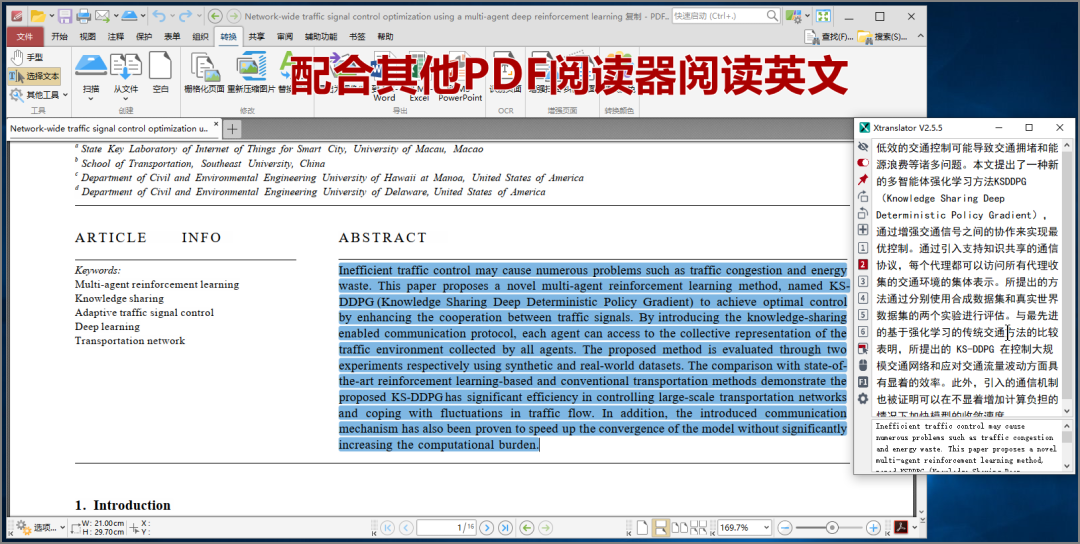 如果您是一个重度PDF注释用户,肯定对知云自己携带的PDF阅读器不满意,那么没有关系,您可以配合其他PDF阅读器使用。但是请不要使用一些奇怪的、过于小众的PDF阅读器,因为他们可能还不如知云自带的PDF阅读器。比较推荐的PDF阅读器是PDF-Xchange PRO、adobe acrobat、FoxitReader。阅读英文网页也是很多同学经常要做的事情。另外还有许多同学不喜欢把PDF文件下载到电脑中,而是直接用浏览器打开PDF文献,并直接在浏览器上阅读英文文献,那么你也可以配合xtranslator的划选翻译来阅读。