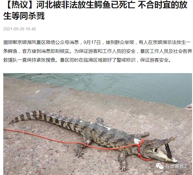 因此,近年来有关“放生”的一些负面报道屡屡引起公众反感。前不久笔者还看到这样一条新闻,河北邯郸武安发生了一起罕见的“放生鳄鱼”事件。据当地村民反映,有人将两条鳄鱼幼崽非法放生到当地一景区水域里,引起当地居民恐慌。