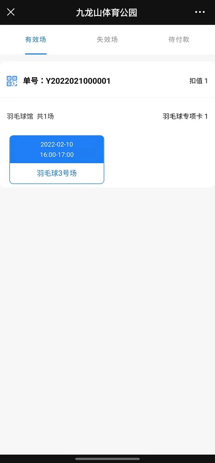 7.支付完成后,跳转至“我的订场”页面查看预约时间,或在系统页面“我的”→“我的订场”查看预约信息。