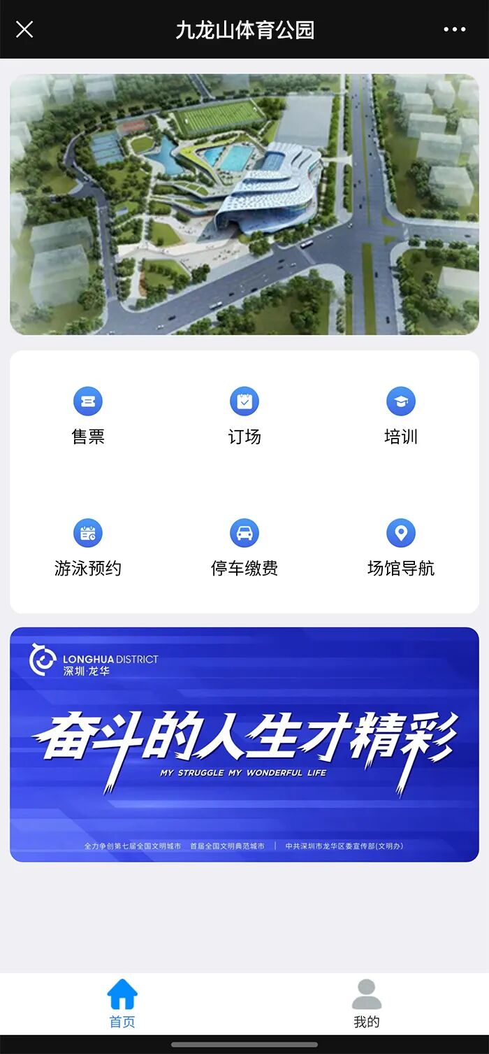 1.关注“龙华文体云”,点击菜单栏“区属场馆”→“九龙山体育公园”;