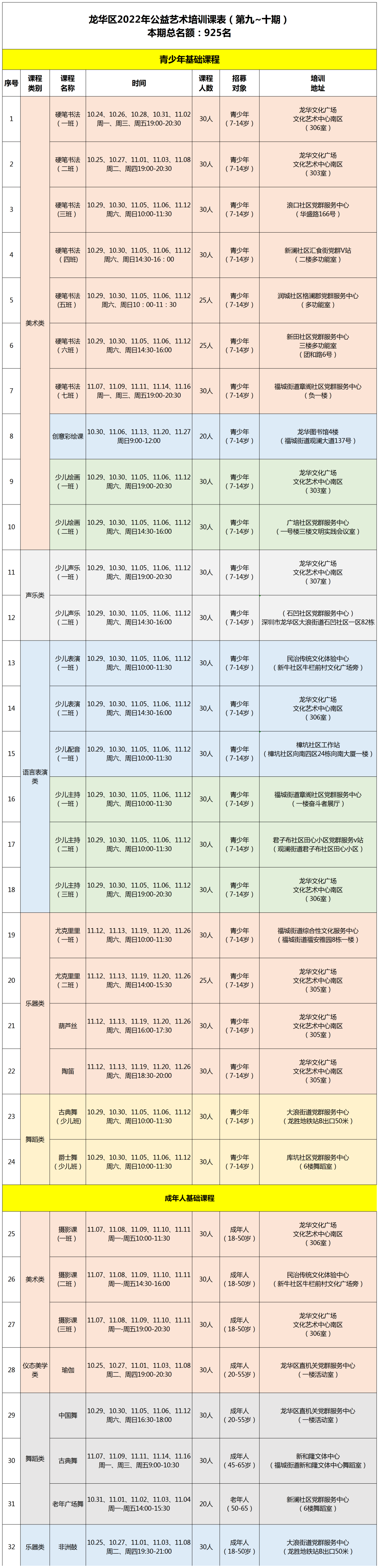 在公众号“龙华文体云”预报名成功的人员,按预报名的时间顺序在后台生成序列号,10月17日进行序列号抽选(系统随机抽取),10月17日~10月18日以短信的方式通知中奖人员获得公益培训名额。