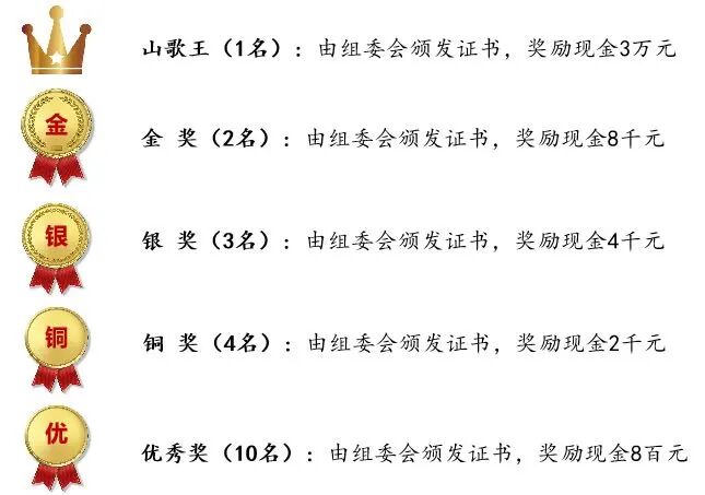 赛事分为客家山歌组、其它山歌组,每组分别设置以下奖项(山歌王由评委会根据本届演唱水准商议)。