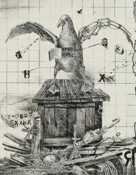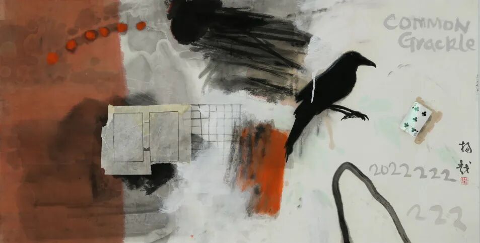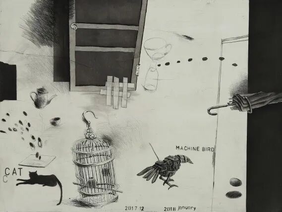 鸟、鱼、猫、马、巢、海螺、椅子、绳索等物像越来越符号化,呈现出形式自身的生命,另一些无法明确定义的几何符号、字母、短语、数字、公式等开始铺陈在同一平面空间之中,以并置、拼接等方式共生共融。杨越将自己的创作过程称为意识流,他已经不再通过完整精心构图、放大等方式来创作,而是将自己的所见、所闻、所想随时表露于画面之上。考虑到他之前对超现实主义的偏爱,意识流似乎顺理成章。但即便如此,他仍然展现出对画面极强的控制能力,以及通过画面传达精神与情感的畅通无阻。