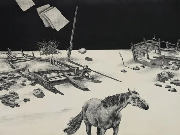 因此,80年代中期杨越在中央美术学院学习时,中国的艺术家铜版画创作才刚刚开始,尚有许多难度和不完善之处。但作为既有悠久传统,又在中国较新的艺术创作手段,这也意味着铜版画有着很多可能。《深秋》(1985)是杨越早期铜版画的代表作,画面的主体是海滩上一艘损毁的木船,木板、绳索、帆布、锚等杂物凌乱堆积其上,显得荒芜而萧索。然而,画面上方一只振翅横飞的鸟打破了沉寂,为画面增添了生机。两相对照,杨越在画面中营造出一种奇特而矛盾的感受。