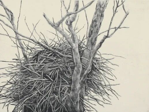 从技法上来看,杨越的铜版画主要以蚀刻为基础,辅以干刻(dry point),并越来越多地使用飞尘和一系列特殊技法来展现微妙的细节效果。这种综合方式接近戈雅以来现代铜版画的主要潮流。戈雅被视为艺术史上最后一位老大师和第一位现代大师,他在综合前人技法和艺术的基础上,大量使用飞尘,并营造出极具精神力量的画面,在版画家版画和艺术家版画之间达成了高度平衡。