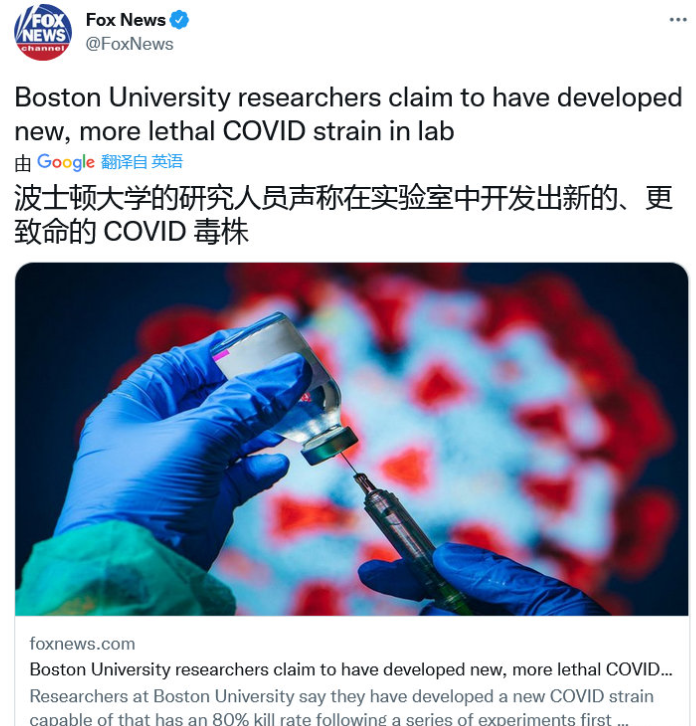 据美媒《福克斯新闻》报道,美国波士顿大学的研究人员声称,已经开发出来全新的,也更为致命的新冠毒株。