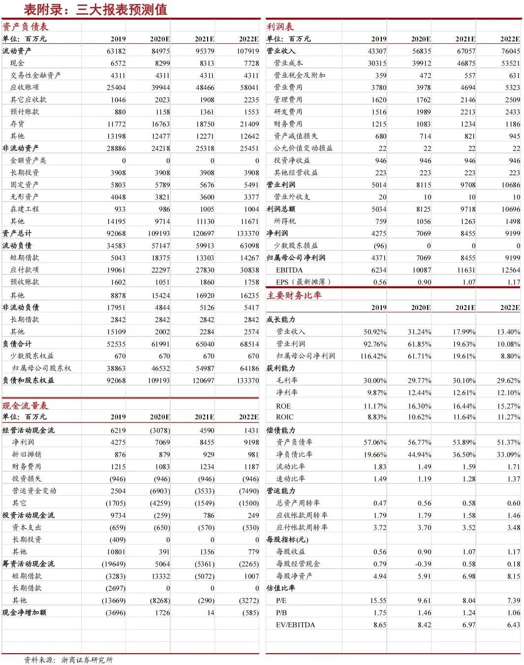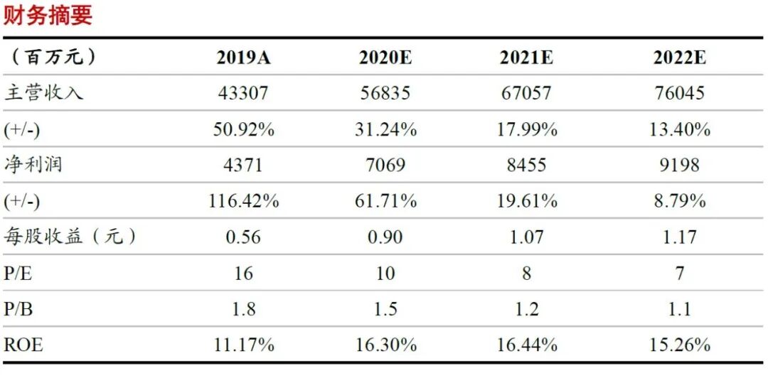 公司三季度加速增长,预计四季度高增速延续,全年业绩有望超预期。因此我们调高全年盈利预测,预计公司2020-2022年可实现归母净利润为71、85、92亿元,同比增长62%/20%/9%,对应EPS为0.90/1.07/1.17元,PE为10/8/7倍。维持“买入”评级。