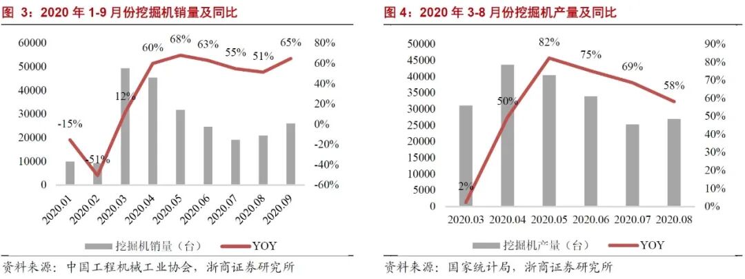 房地产投资增速维持高位,房屋新开工面积及基建投资额保持增长。2020年7、8月份房地产固定资产投资额分别为12544亿元、13130亿元,同比增长11.7%、11.8%;房地产新开工面积分别同比增长11.3%、2.4%;2020年4-8月份,基建投资额(不含电力)累计投资增速为-12%、-6%、-3%、-1%、-0.3%,当月同比增速分别是2%、8%、7%、8%、4%,连续5个月保持正增速。四季度增长态势有望延续,持续带动工程机械行业需求。