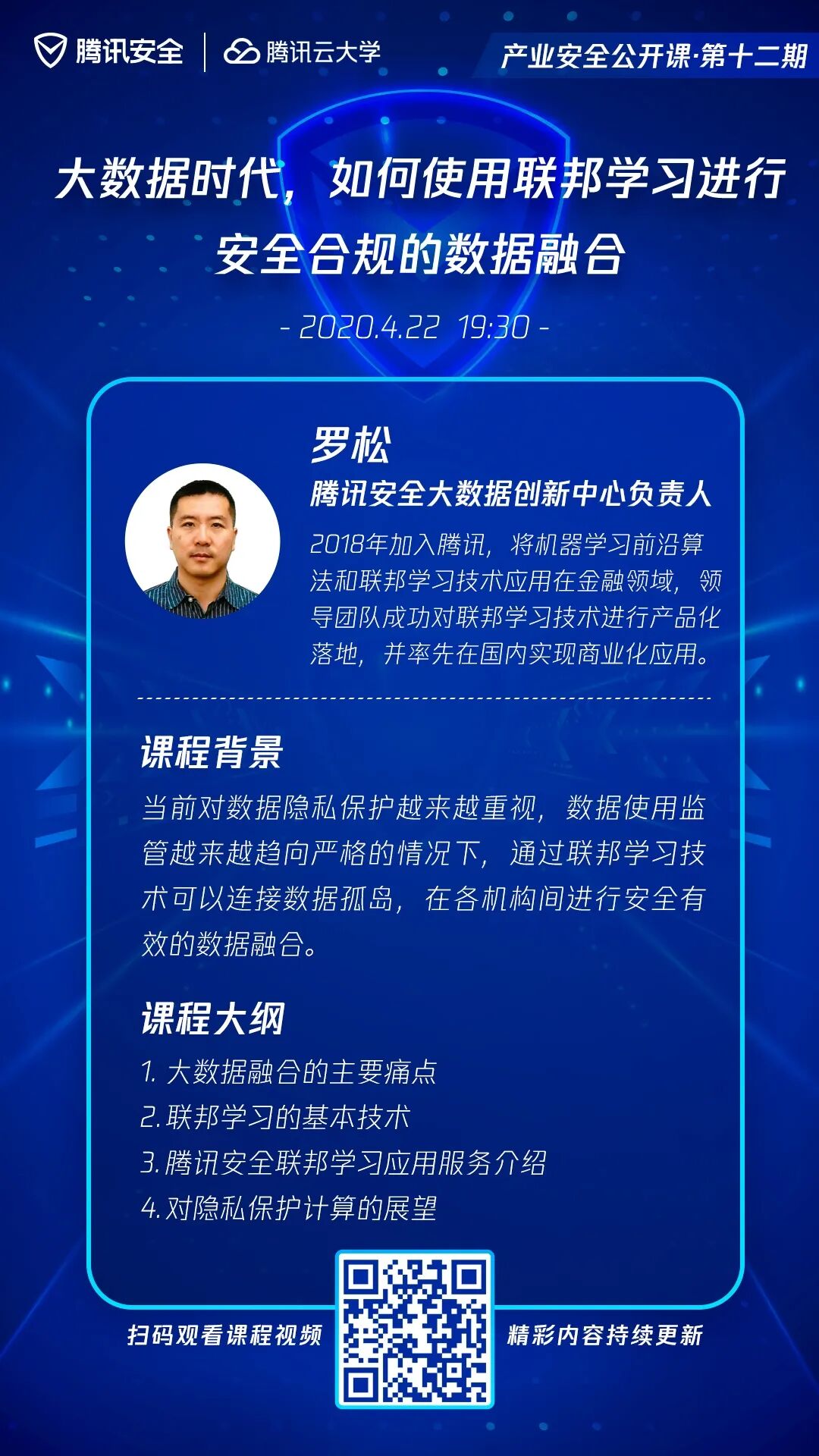 回复联邦学习课程获取报告PPT近年来随着人工智能技术的高速发展,社会各界对隐私保护的需求不断加强,数据使用监管越来越趋向严格。这给人工智能应用带来巨大的安全挑战:企业机构之间的数据无法互通,数据割裂、数据孤岛问题严重,AI建模的效能难以得到充分发挥。本课程为用户详细介绍了联邦学习技术如何连接数据孤岛、进行安全有效的数据融合,并从行业痛点、基本技术和应用服务等维度全面解读腾讯安全的联邦学习产品和实用建议。👉5分钟速看联邦学习精华《企业如何应用“联邦学习”打破数据孤岛,助力业务创新?》![]()
