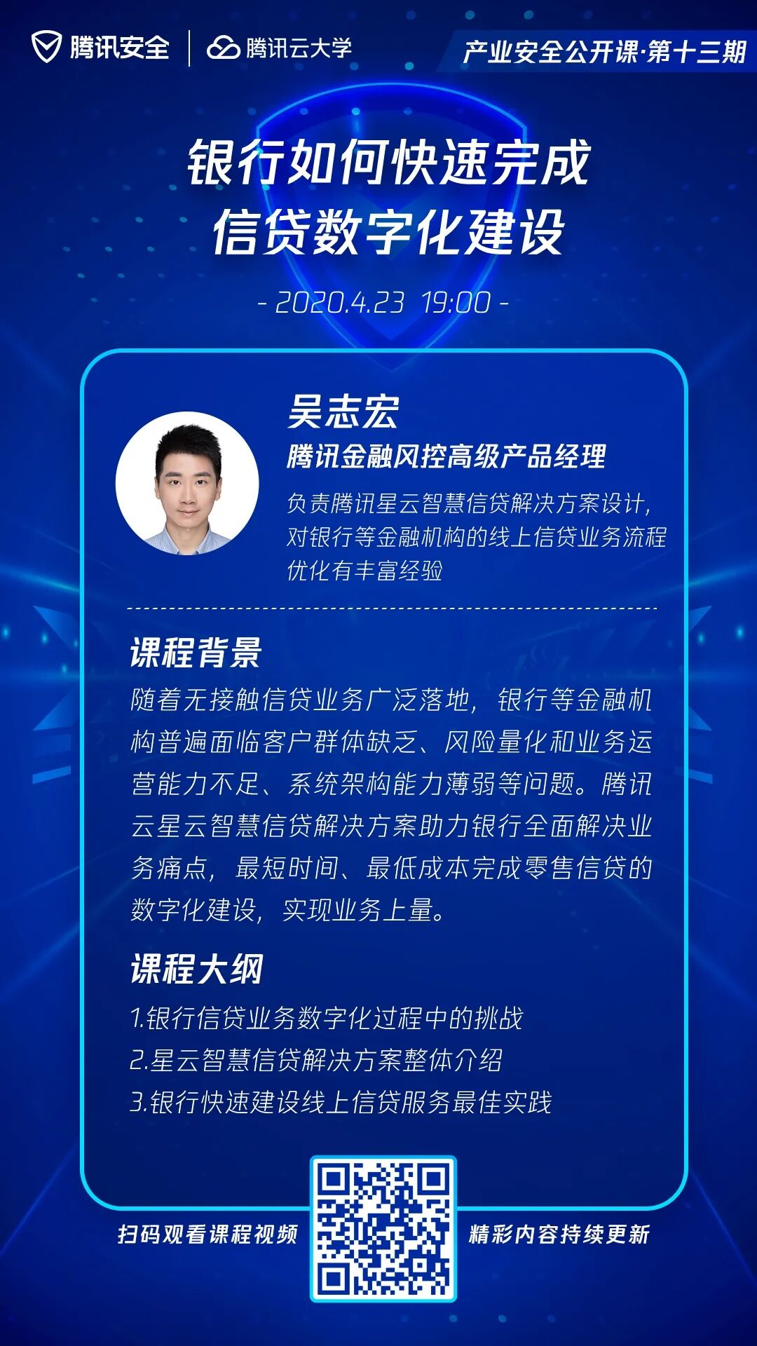 突如其来的全球疫情催生了“非接触经济”。在银行业务板块中,无接触信贷对于现阶段帮助中小企业复工复产、助力经济回暖起到了关键作用。然而随着无接触信贷业务地广泛落地,银行等金融机构逐渐暴露出客户群体缺乏、风险量化和业务运营能力不足、系统架构能力薄弱等问题。本期课程通过深入剖析银行信贷业务数字化的挑战和痛点,以腾讯云星云智慧信贷解决方案为例阐述安全解决方案如何助力银行在最短时间、最低成本的条件下,完成零售信贷的数字化建设,实现业务上量。非接触式金融服务中,