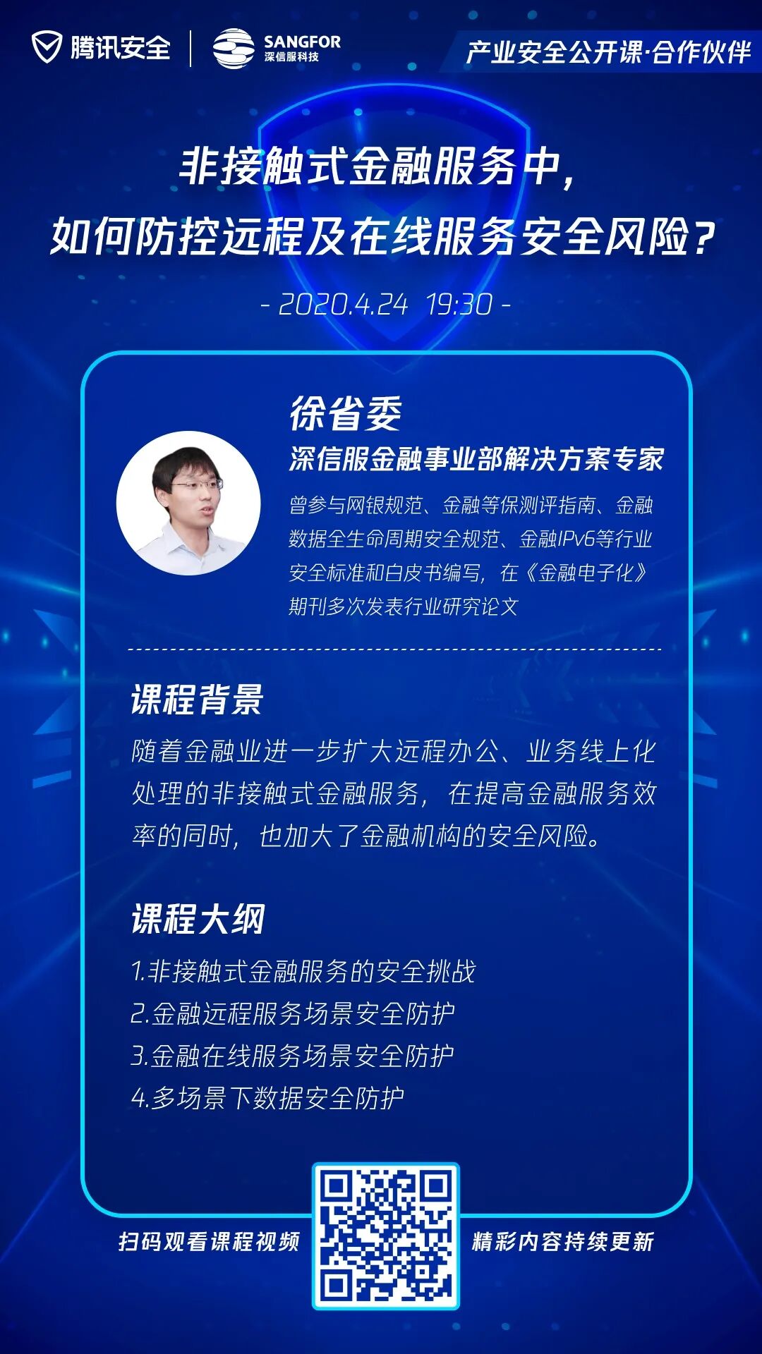 回复非接触式金融课程获取报告PPT“低接触、非接触式”式交易直击银行金融痛点,银行金融机构如何创新产品和服务,对客户进行线上资金“供血”成为金融机构的难点之一。然而随着远程办公、业务线上化处理的非接触式金融服务的推广,在提高金融服务效率的同时,也加大了金融机构的安全风险。本期课程中深信服金融安全专家聚焦非接触式金融服务中的信息安全风险,从远程办公、开放银行、网上银行、个人金融信息等方面介绍如何保障非接触式金融服务安全。想了解更多公开课的精彩内容?
