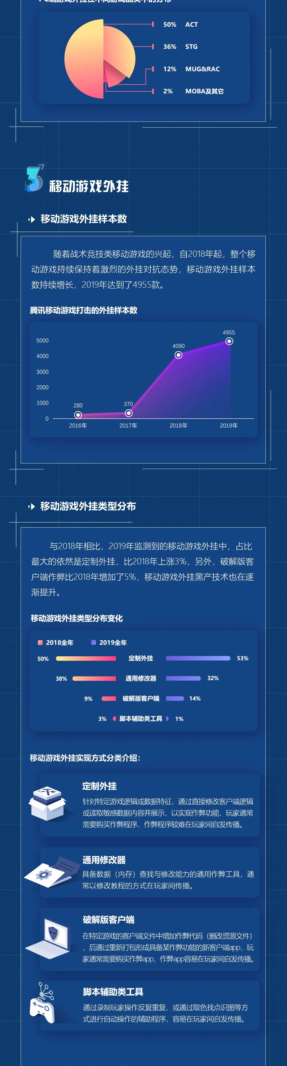 1. PC端游戏外挂:2019年PC端游戏打击掉的外挂样本数相比2018年增长了19.9%。