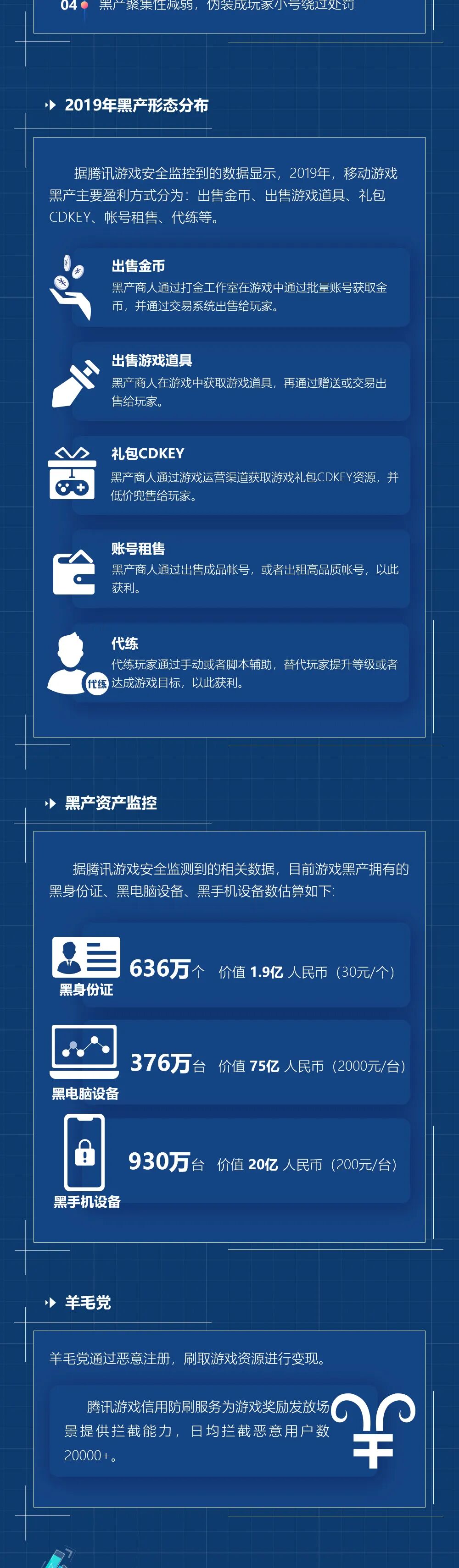 4. 工作室和黑产:据腾讯游戏安全监测到的相关数据,目前游戏黑产拥有的黑身份证有636万个,黑电脑设备376万台,黑手机设备930万台,总价值近百亿。