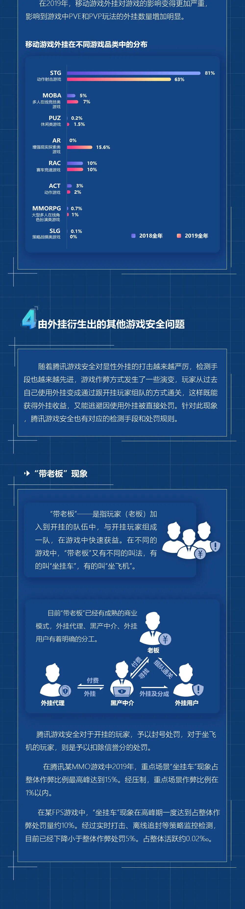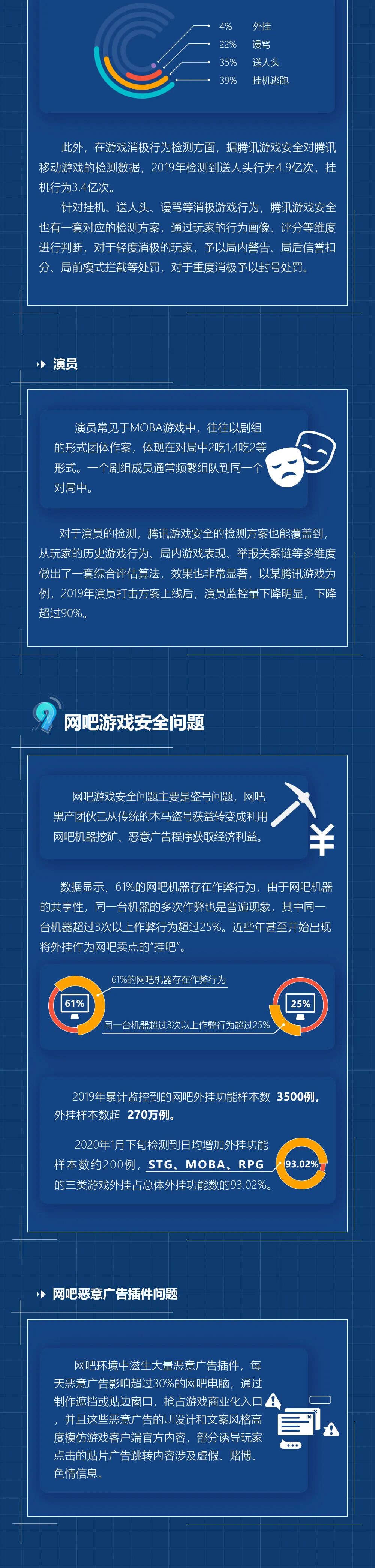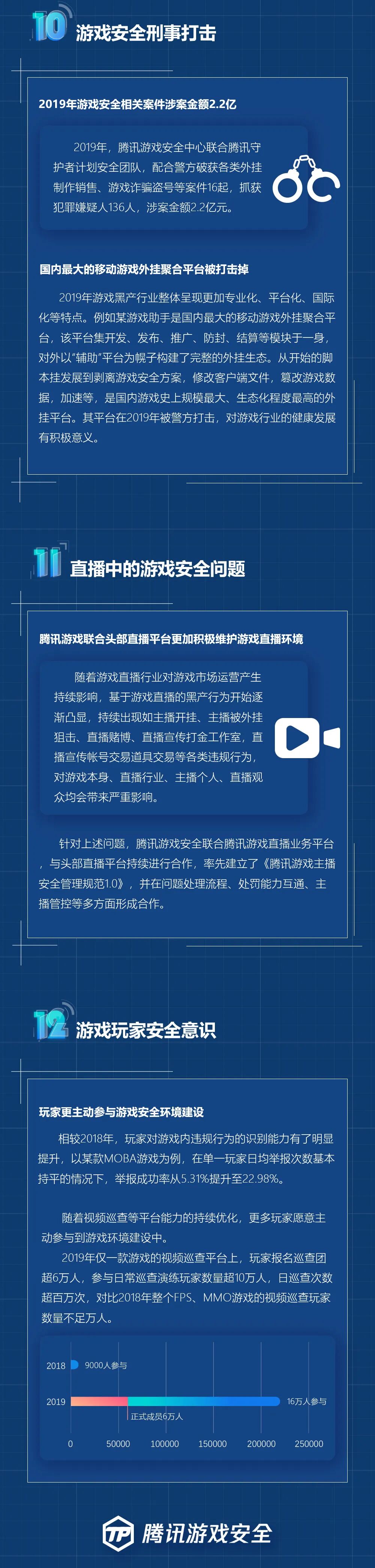 8. 游戏安全刑事打击:2019年游戏安全案件涉案金额达2.2亿,腾讯游戏安全配合警方打击掉国内最大的移动游戏外挂聚合平台。