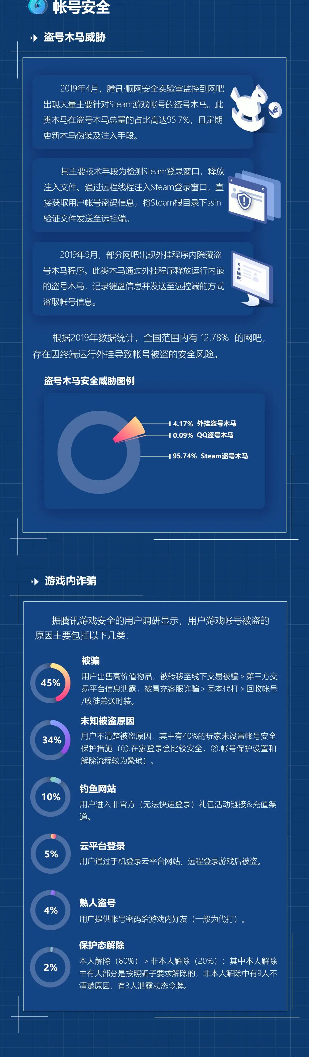 5. 用户游戏账号被盗多因被诈骗:腾讯游戏安全用户调研显示,玩家被骗导致账号被盗的情况达45%,在各类原因中占比最高。