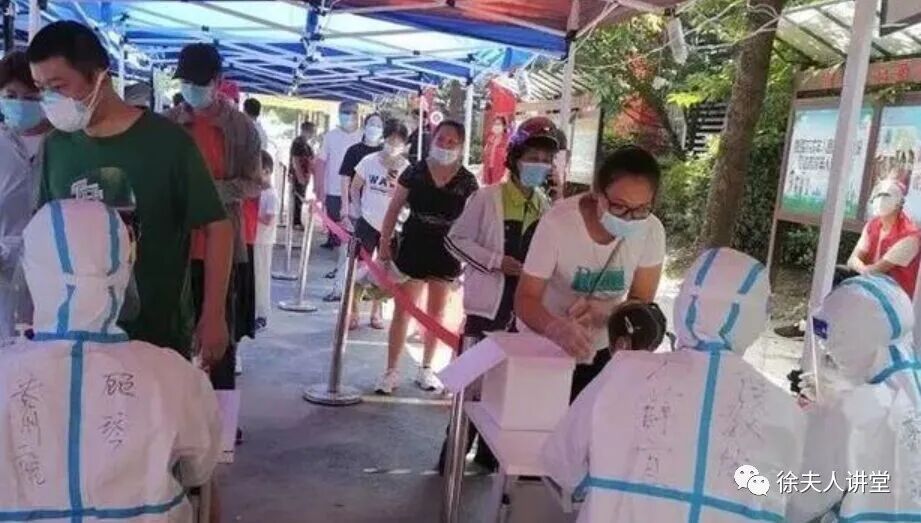 快排到检测点时,地上开始有了一米线,每十人一组,到我检测的时候,发现十个人的采样在一个小管子里放着,检测人员用手折断取样,再去拿下一个棉签。我怀疑不规范,问工作人员万一有一个感染的怎么办?他说把十个人都抓走。就是这么讲的,第一次就这样检测了。(我回去后朋友圈也讲了经过)