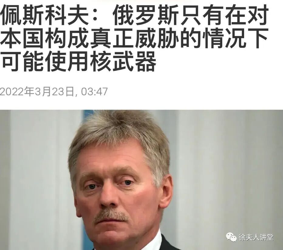 当佩斯科夫被问及俄罗斯是否可以完全排除使用核武器的可能性时,佩斯科夫回答称,俄罗斯有一个国家安全概念,可以阅读到所有使用核武器的理由。因此,如果它是对俄国的生存威胁,那么就可以根据俄罗斯的战略来使用核武器。
