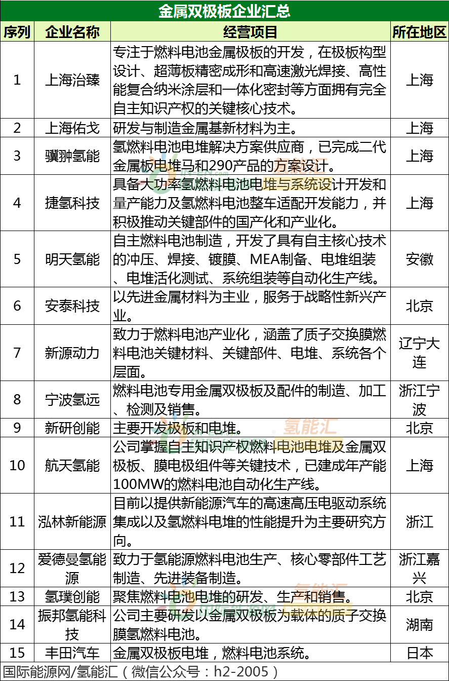 目前车用燃料电池的发展受到了国内外广泛的关注,而双极板作为PEMFCs的关键零部件之一,也逐渐成为研究热点。据了解,目前国内知名的双极板企业主要有:国鸿氢能、上海治臻新能源、上海弘竣新能源、浙江华熔科技有限公司、明天氢能、氢璞创能、嘉裕碳素、振邦氢能、弘枫实业、神州碳制品、鑫能石墨、佑戈金属、安泰环境、宝碳石墨、金亚隆新材料、西部材料、深圳南科、深圳氢雄等等,具体情况如下表。
