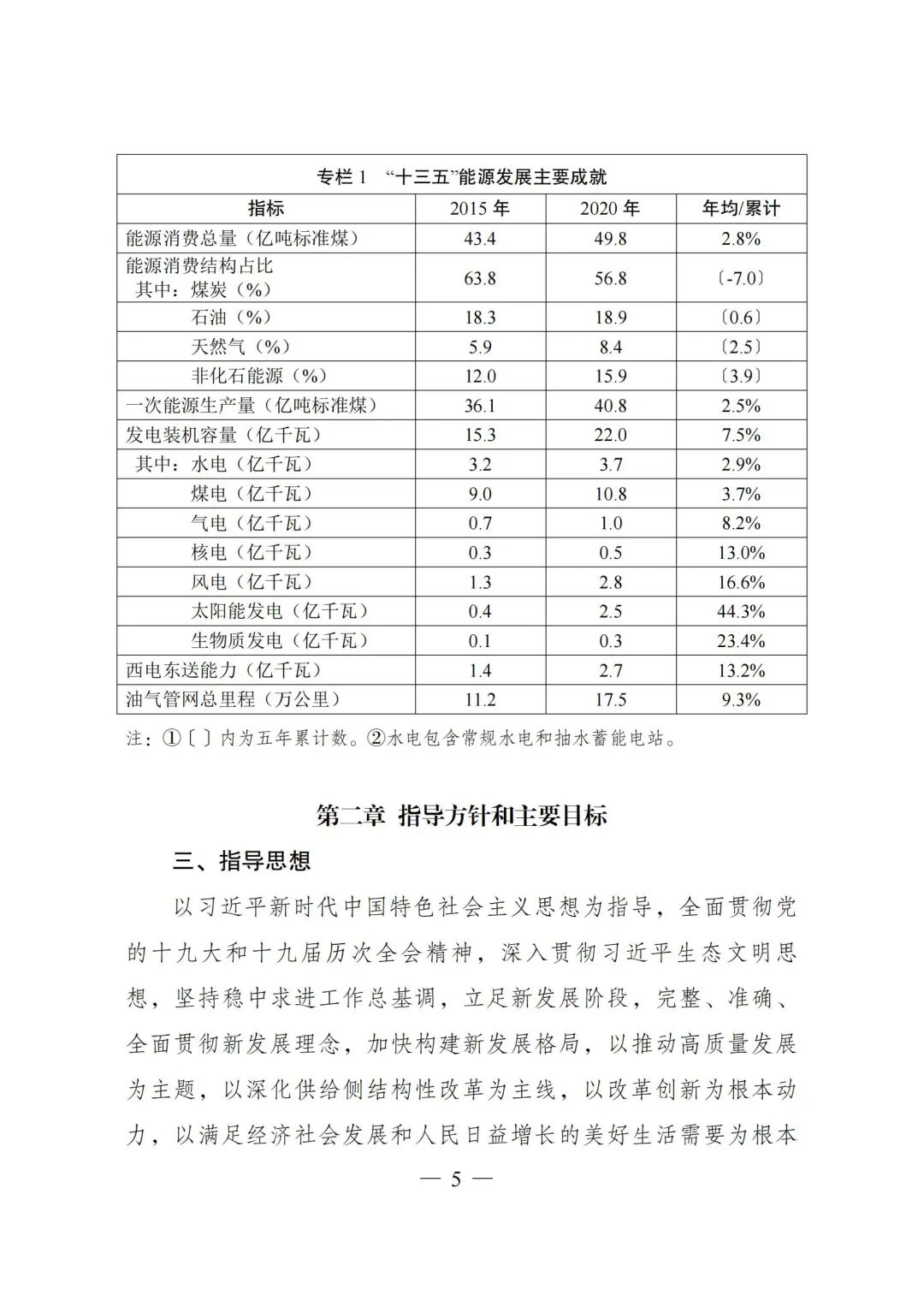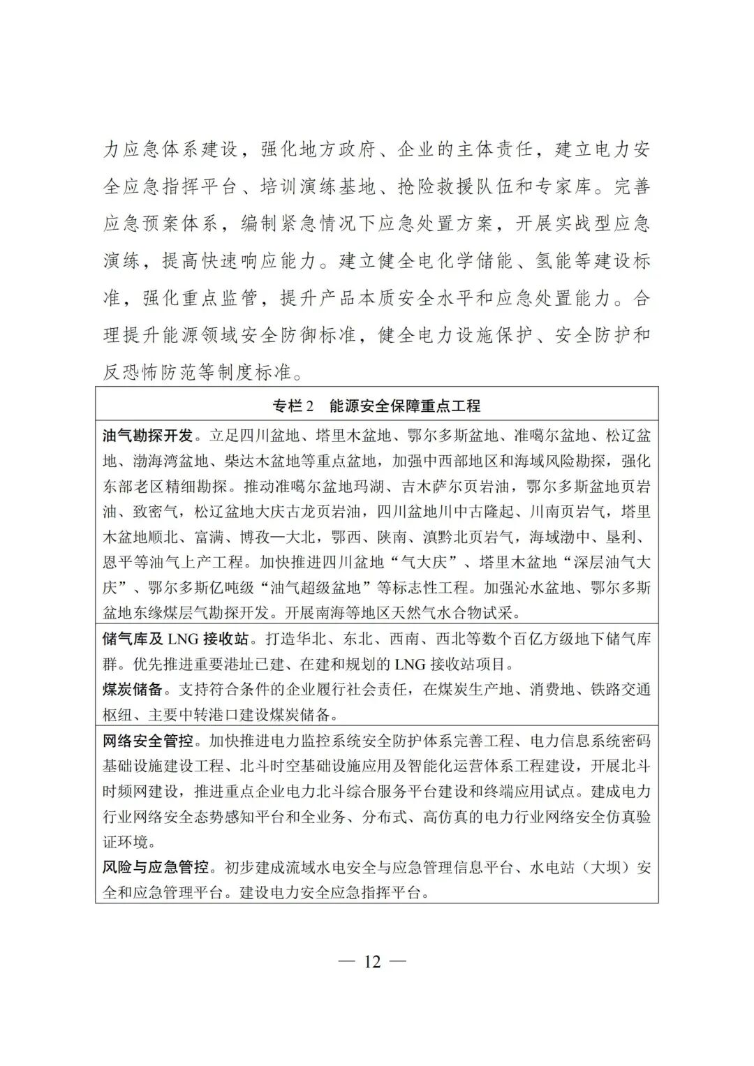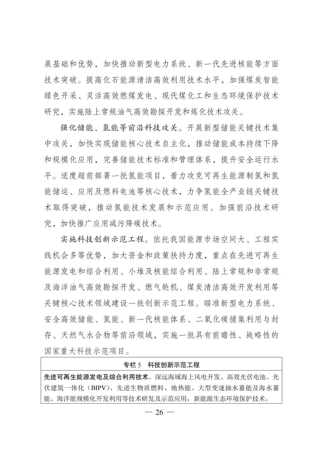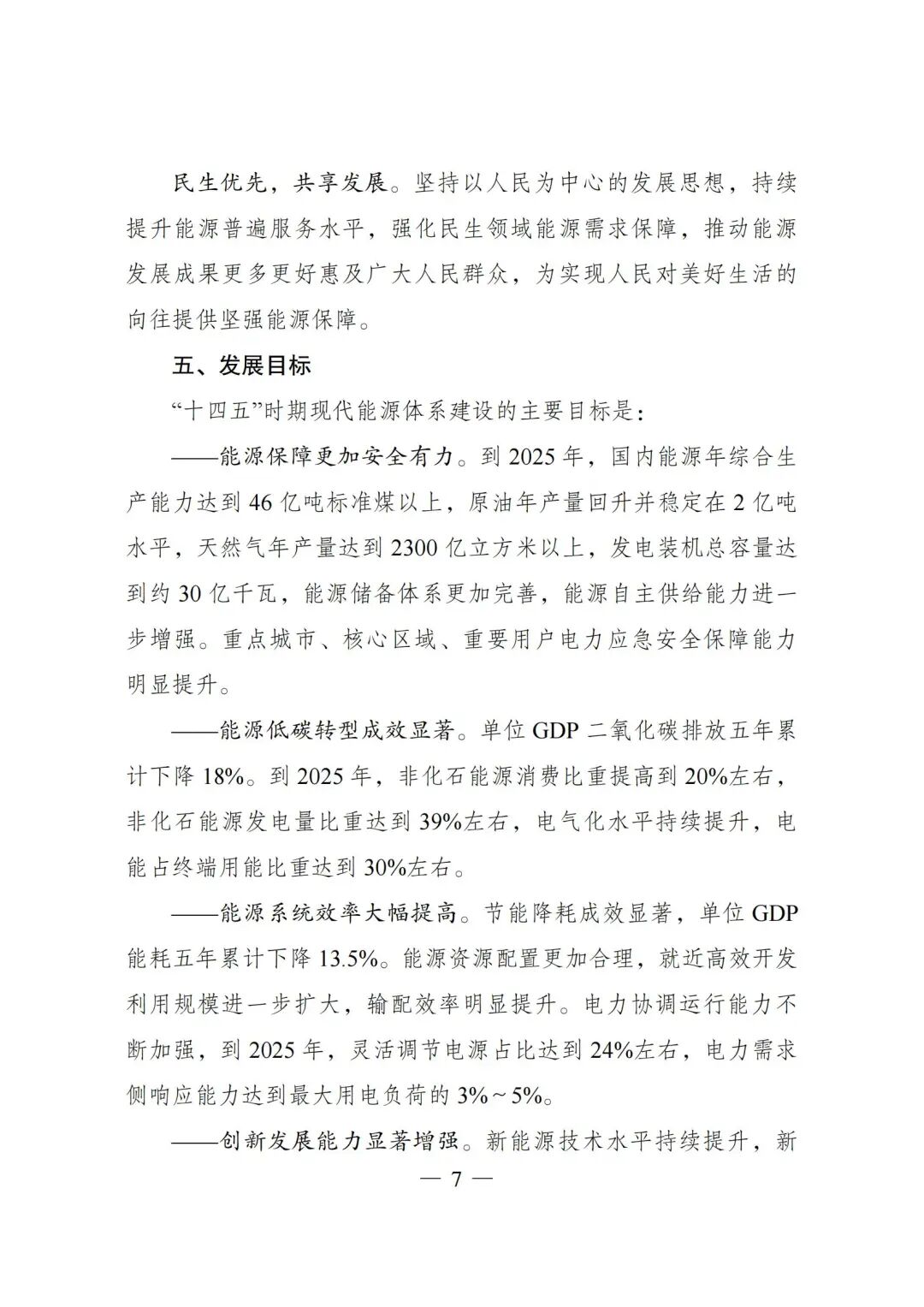 ——能源保障更加安全有力。到2025年,国内能源年综合生产能力达到46亿吨标准煤以上,原油年产量回升并稳定在2亿吨水平,天然气年产量达到2300亿立方米以上,发电装机总容量达到约30亿千瓦,能源储备体系更加完善,能源自主供给能力进一步增强。重点城市、核心区域、重要用户电力应急安全保障能力明显提升。——能源低碳转型成效显著。单位GDP二氧化碳排放五年累计下降18%。到2025年,非化石能源消费比重提高到20%左右,非化石能源发电量比重达到39%左右,电气化水平持续提升,电能占终端用能比重达到30%左右。——能源系统效率大幅提高。节能降耗成效显著,单位GDP能耗五年累计下降13.5%。能源资源配置更加合理,就近高效开发利用规模进一步扩大,输配效率明显提升。电力协调运行能力不断加强,到2025年,灵活调节电源占比达到24%左右,电力需求侧响应能力达到最大用电负荷的3%~5%。——创新发展能力显著增强。新能源技术水平持续提升,新型电力系统建设取得阶段性进展,安全高效储能、氢能技术创新能力显著提高,减污降碳技术加快推广应用。能源产业数字化初具成效,智慧能源系统建设取得重要进展。“十四五”期间能源研发经费投入年均增长7%以上,新增关键技术突破领域达到50个左右。——普遍服务水平持续提升。人民生产生活用能便利度和保障能力进一步增强,电、气、冷、热等多样化清洁能源可获得率显著提升,人均年生活用电量达到1000千瓦时左右,天然气管网覆盖范围进一步扩大。城乡供能基础设施均衡发展,乡村清洁能源供应能力不断增强,城乡供电质量差距明显缩小。展望2035年,能源高质量发展取得决定性进展,基本建成现代能源体系。能源安全保障能力大幅提升,绿色生产和消费模式广泛形成,非化石能源消费比重在2030年达到25%的基础上进一步大幅提高,可再生能源发电成为主体电源,新型电力系统建设取得实质性成效,碳排放总量达峰后稳中有降。加快发展风电、太阳能发电。全面推进风电和太阳能发电大规模开发和高质量发展,优先就地就近开发利用,加快负荷中心及周边地区分散式风电和分布式光伏建设,推广应用低风速风电技术。在风能和太阳能资源禀赋较好、建设条件优越、具备持续整装开发条件、符合区域生态环境保护等要求的地区,有序推进风电和光伏发电集中式开发,加快推进以沙漠、戈壁、荒漠地区为重点的大型风电光伏基地项目建设,积极推进黄河上游、新疆、冀北等多能互补清洁能源基地建设。积极推动工业园区、经济开发区等屋顶光伏开发利用,推广光伏发电与建筑一体化应用。开展风电、光伏发电制氢示范。鼓励建设海上风电基地,推进海上风电向深水远岸区域布局。积极发展太阳能热发电。推动电力系统向适应大规模高比例新能源方向演进。统筹高比例新能源发展和电力安全稳定运行,加快电力系统数字化升级和新型电力系统建设迭代发展,全面推动新型电力技术应用和运行模式创新,深化电力体制改革。以电网为基础平台,增强电力系统资源优化配置能力,提升电网智能化水平,推动电网主动适应大规模集中式新能源和量大面广的分布式能源发展。加大力度规划建设以大型风光电基地为基础、以其周边清洁高效先进节能的煤电为支撑、以稳定安全可靠的特高压输变电线路为载体的新能源供给消纳体系。建设智能高效的调度运行体系,探索电力、热力、天然气等多种能源联合调度机制,促进协调运行。以用户为中心,加强供需双向互动,积极推动源网荷储一体化发展。创新电网结构形态和运行模式。加快配电网改造升级,推动智能配电网、主动配电网建设,提高配电网接纳新能源和多元化负荷的承载力和灵活性,促进新能源优先就地就近开发利用。积极发展以消纳新能源为主的智能微电网,实现与大电网兼容互补。完善区域电网主网架结构,推动电网之间柔性可控互联,构建规模合理、分层分区、安全可靠的电力系统,提升电网适应新能源的动态稳定水平。科学推进新能源电力跨省跨区输送,稳步推广柔性直流输电,优化输电曲线和价格机制,加强送受端电网协同调峰运行,提高全网消纳新能源能力。增强电源协调优化运行能力。提高风电和光伏发电功率预测水平,完善并网标准体系,建设系统友好型新能源场站。全面实施煤电机组灵活性改造,优先提升30万千瓦级煤电机组深度调峰能力,推进企业燃煤自备电厂参与系统调峰。因地制宜建设天然气调峰电站和发展储热型太阳能热发电,推动气电、太阳能热发电与风电、光伏发电融合发展、联合运行。加快推进抽水蓄能电站建设,实施全国新一轮抽水蓄能中长期发展规划,推动已纳入规划、条件成熟的大型抽水蓄能电站开工建设。优化电源侧多能互补调度运行方式,充分挖掘电源调峰潜力。力争到2025年,煤电机组灵活性改造规模累计超过2亿千瓦,抽水蓄能装机容量达到6200万千瓦以上、在建装机容量达到6000万千瓦左右。加快新型储能技术规模化应用。大力推进电源侧储能发展,合理配置储能规模,改善新能源场站出力特性,支持分布式新能源合理配置储能系统。优化布局电网侧储能,发挥储能消纳新能源、削峰填谷、增强电网稳定性和应急供电等多重作用。积极支持用户侧储能多元化发展,提高用户供电可靠性,鼓励电动汽车、不间断电源等用户侧