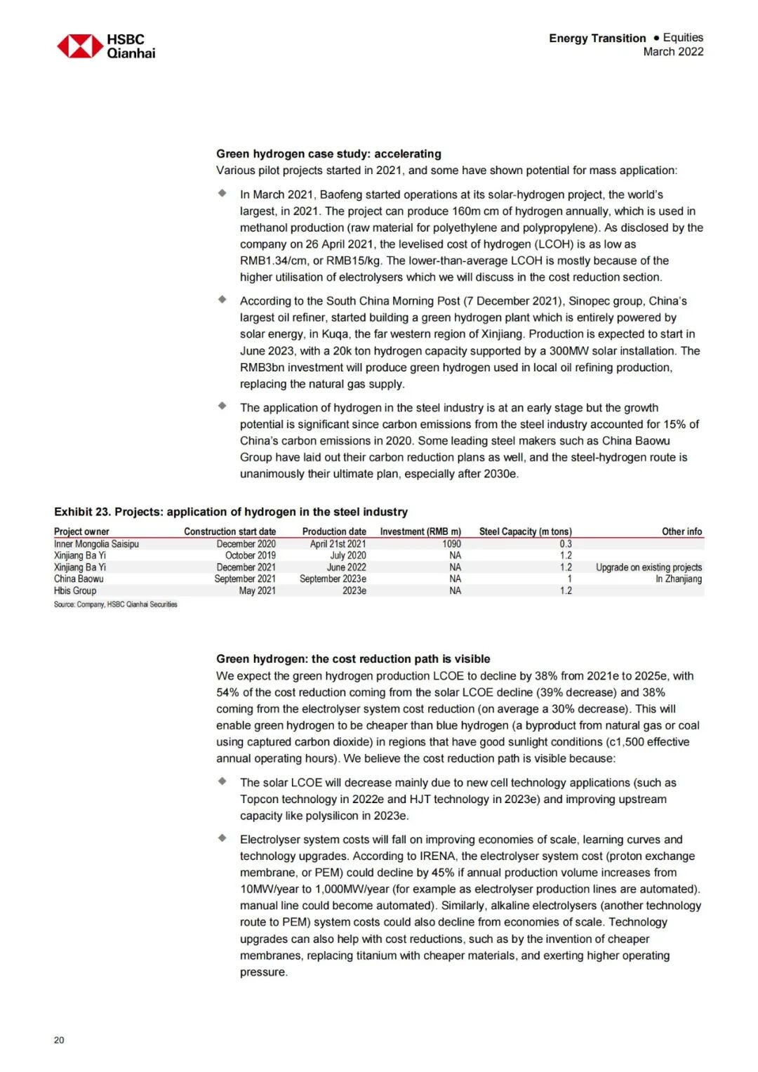 近日,汇丰银行前海证券公司发布了《中国绿色氢为黄金时段做好准备》研究报告。报告指出:“由于电解槽成本、电解水制氢的设备成本和太阳能成本的下降,2022-2025年绿色氢的成本将下降38%。”