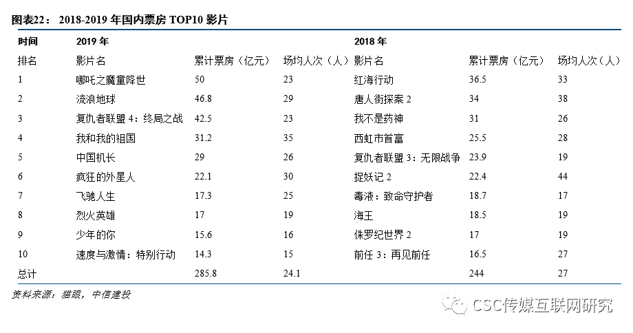 电影行业存在优质供给决定需求,我们认为优质国产电影有望带动国内电影票房。2017-2019国产电影票房占比不断提升,从2017年的54%提升至2019年的64%。在头部影片方面,2019年票房TOP10电影中,国产电影占据了8席,较2018年增长2部,累计票房229亿元,同比增长38%,TOP10电影中国产电影票房占比约80%,同比提升12pct。我们认为随着国内电影工业水平的不断提升,优质国产电影有望进一步拉动票房增长。