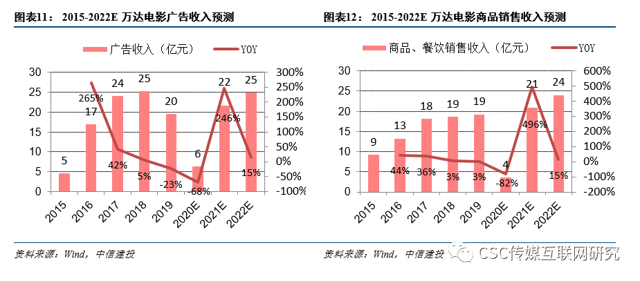 万达院线相关收入:预计2020-2022影院相关业务总收入分别为42.3 /142.5 /169.3亿元,同比增速分别为-67.5% /236.8% /18.8%,毛利润分别为-5.9 /39.7 /47.2亿元,毛利率分别为-13.9% /27.8% /27.8%。