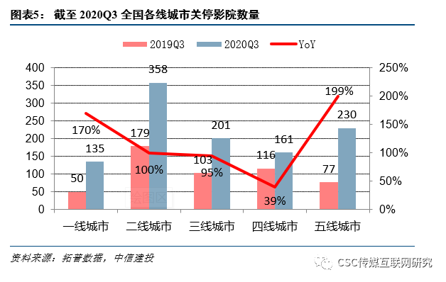 疫情影响2020年Q3影院关闭数量同比翻倍,全国影院数量较年初下滑15%。根据拓普数据,受疫情影响截至2020年Q3全国关闭影院数量约1085家,同比上升107%,其中一 /二 /三 /四 /五线城市影院关闭数量分别为135 /358 /201 /161 /230家,分别同比上升170% /100% /95% /39% /199%,从绝对值上来看,二线和五线城市影院关闭数量较高。截至2020年Q3,全国影院数量为1.05万家,较2020年初下滑15%,银幕数量为6.47万块,较2020年初下滑7%。