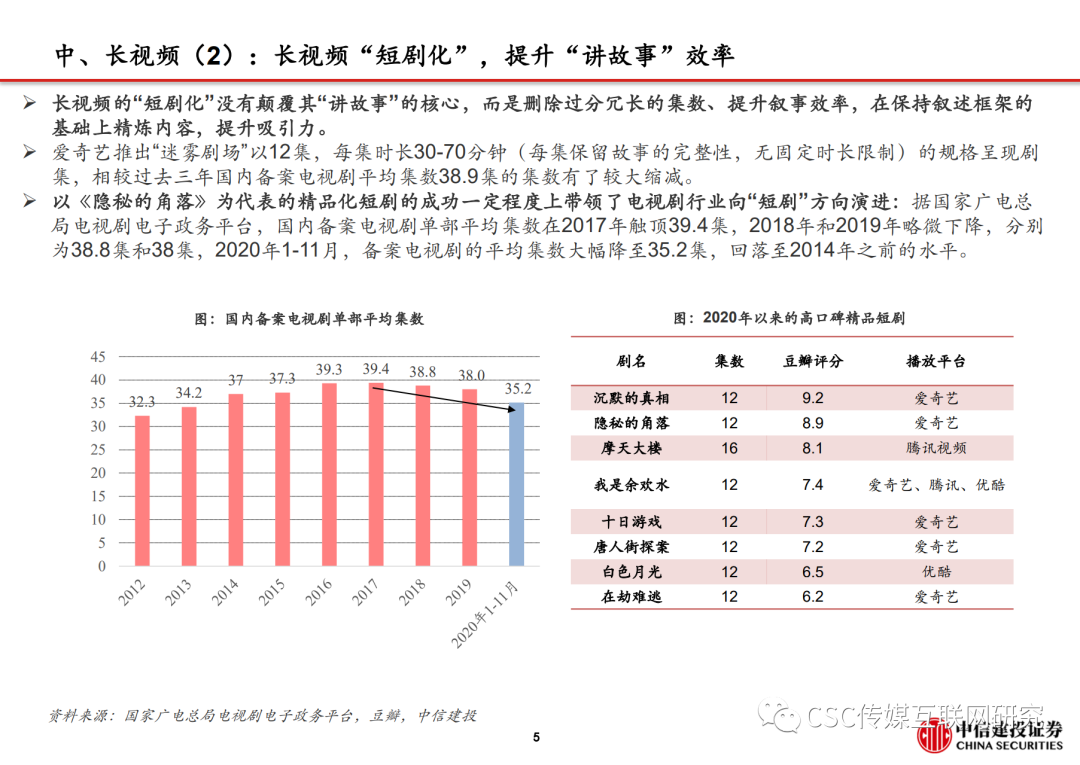 ➢长视频以叙述故事为主,相对短视频“开篇即高潮”的体验,长视频需要较多的铺陈并娓娓道来,因此能与观众建立更为深度的情感联结,观看长视频实际是解决观众深度的情感、价值需求,用户此类需求刚性且持久,根据QuestMobile,2020年12月,在线视频行业渗透率为75.1%,仅次于短视频的75.2%,在使用时长方面,长视频的使用时长稳定,平均月使用13.8小时,在短视频、游戏等其他泛娱乐内容的时长竞争下依然保持了较好的韧性和时长的绝对规模。