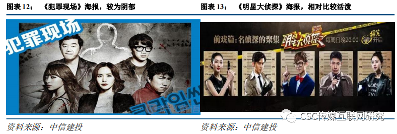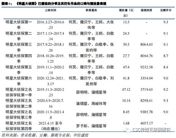剧本杀的核心玩家是以90后、95后为代表的Z世代。Z世代成长于线上娱乐消费快速发展的时期,但是线下娱乐消费的功能始终未被替代。线下娱乐提供的真人体验、社交功能和部分玩法是线上难以替代的。根据艾媒咨询数据显示,剧本杀及密室行业消费者年龄分布中,83.86%为20-35岁的消费者;接近50%的90后体验过相关线下娱乐项目,00后则超过了55%。剧本杀游戏在Z世代的逐步风靡,主要是由于其满足了玩家在娱乐、社交和沉浸表演上的需求:Ø 大众化的娱乐需求:“剧本杀”通过对内容和剧情的设置满足大部分参与者的游戏体验,不需要玩家有过高的游戏水平。KTV、看电影等线下旧娱乐形式和密室逃脱、电竞馆、娃娃机等线下新娱乐形态,玩家的最终体验往往与个人游戏水平相关,容易变成少部分人的娱乐。剧本杀在剧本设置中,最重要的要求就是游戏中每一个角色都要起到关键作用,确保每一个玩家在游戏中的参与感。同时剧本杀的玩法新颖、自由,不易于让玩家被游戏玩法所束缚。游戏上手难度比较低,新老玩家差距不大,提升了所有玩家的游戏体验,因此剧本杀更满足大众化的娱乐需求。Ø 社交需求:剧本杀游戏同时满足熟人社交和陌生人社交的两类社交需求。剧本杀游戏玩家玩家一般需要线上预约场地。即使玩家数不满足最低人数要求,预约环节可以通过拼团的形式凑齐人数。在凑人数的过程中,同时兼顾了熟人和陌生人社交。而KTV、电影院等线下旧娱乐主要满足消费者熟人社交需求。同时剧本杀低对抗、重表演带来的游戏体验比较轻松,不需要玩家有很高的游戏水平,社交氛围比较轻松。因此相较于其他线下娱乐形式,剧本杀在社交需求的推动上比较全面、效率更高。Ø 沉浸式表演需求:剧本杀游戏提供了玩家可以进行多人表演的空间和剧本。每一次剧本杀游戏,玩家都在其中体验了一个全新的“人生”,并满足了玩家的表演欲望。1.4剧本杀在中国的发展:爆款综艺成为“破圈”的重要节点2016年3月芒果TV《明星大侦探》上线,至今已录制6季,取得了优秀的口碑和流量成绩。《明星大侦探》的综艺灵感来自于韩国“谋杀之谜”玩法综艺《犯罪现场》。《明星大侦探》从2016年推出后,单季的点击量从10亿+增长到40亿+,同时其豆瓣评分始终保持在9分左右,是系列综艺中较为少见的高评分成绩。除了芒果TV的《明星大侦探》之外,优酷和爱奇艺也分别推出《现身吧!嫌疑人》、《奇艺剧本鲨》等类似的综艺节目。根据芒果2021年的综艺片单来看,今年芒果TV还将推出《明星大侦探》第七季及其衍生的作品《闪耀的侦探家族》。剧本杀是《明侦》综艺火爆之后的约定俗成叫法。《明星大侦探》一开始播出,还没有“剧本杀”的叫法,粉丝们会称之为中国版的《犯罪现场》,或者还是以明星真人秀的视角来看待。随着综艺的品牌化和季播化,“谋杀之谜”的玩法进入了玩家视野,而后形成了“剧本杀”的叫法。![]()