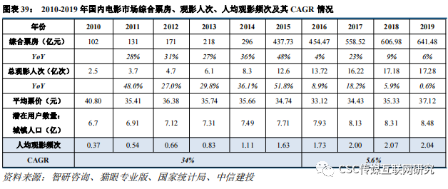 基于前面对于剧本杀产业链上下游的分析,我们对行业未来的发展趋势有几项判断:1)线下化趋势将会加快,线上APP更多会作为轻度体验和导流工具。剧本杀的核心是真人表演+沉浸体验,线上虽然便捷、低价,难以完全取代线下的体验。2)获取新用户是提升边际收益的关键:由于剧本杀游戏几乎难以进行重复体验,因此对于剧本杀门店来说,一方面持续更新剧本,另一方面也需要通过营销持续引入新玩家,从而达到对单个剧本的收益最大化。3)以IP、内容、社群留住老玩家:相较于新玩家,对于已经有经验的剧本杀老玩家而言,源源不断更新的优质剧本,以及通过剧本杀带来的社交体验,则是留住他们的核心因素。4)当前产业链内所有环节均分散,未来部分环节有望集中度开始提升。Ø 线下店部分开始出现连锁化,形成品牌效应,从而获取更好的上游剧本资源并降低营销成本。部分已有规模的线下店,开始自行培养作者以获取独家剧本。规模化经营有望带来独家内容壁垒的建立。Ø 中游发行环节最具规模效应,集中度有望提升:从产业链环节来看,剧本杀上游的作者端和下游门店端,仍然将长期处于分散的格局,即使出现连锁化经营的线下店,市场也难以在短期集中度显著提升。而中游剧本发行环节,连接分散的上下游,是信息、内容、资源的重要中介载体。发行端的商业模型为“收入=剧本内容数量×单个内容销售量×单价×分成比例”。在分成比例维持不变的前提下,发行方尽可能的签约更多作者,并在全国范围内建立销售网络,积极参加各类剧本杀展会,则可以实现收入最大化。从这个角度来看,在整个剧本杀产业链中,发行环节是最具有规模效应的。未来大型的剧本发行商,还有能力对上游作者产生议价,从而获取更高的分成比例。当前剧本的线上和线下展会销售,仍然存在诸多不足,集中体现在效率和匹配的问题上。线上无法完全体验内容,为下游匹配最佳剧本;线下展会虽然能一定程度上解决,但实地参展又耗时耗力。若中游发行环节持续集中,行业有可能出现更优化的的方法,解决这一问题。Ø 中长期来看,行业持续发展、线下门店获客,其核心仍然是内容。持续稳定的高质量内容供给,是剧本杀行业持续导入年轻用户的核心。5)盗版问题亟需规范。剧本杀行业的盗版对于上中下游的伤害都非常严重,且由于当前行业行业上中下游都比较分散,导致版权维护难度较高,目前行业还没有找到有效的方法对盗版进行制约。6) VR等新技术有望在未来对剧本杀行业带来更大想象空间。Ø VR技术可以提供布景、换装等圆桌形式剧本杀无法提供的内容。通过VR技术,可以将大部分剧本需要呈现的实景内容,以VR的形式低成本呈现出来;Ø 比起线下实景,VR技术可以更逼真地呈现部分场景,提供更强的沉浸感和代入感; 2020年,基于芒果IP《明星大侦探》打造的实时VR剧本杀互动馆在长沙的“青春芒果城”内开业。2021年2月,由芒果授权的VR剧本杀门店“芒果探案馆”在上海开了第一家分店。根据我们对大众点评的调研,在上线三个月后,芒果探案馆在上海密室中星级分排名达到前26%,人均消费171元/人也要高于大部分其他的剧本杀门店。 由于剧本杀与电影行业均为低复玩率、较高沉浸度的线下内容娱乐消费,业态相近,因此我们对照电影市场来测算剧本杀市场的规模。我国电影市场从2010年达到100亿规模后快速发展,在平均票价与城镇人口数量较为稳定的背景下,行业主要驱动因素是人均观影频次。2010-2019年至今,电影行业的人均观影频次有两阶段的发展:Ø 2010-2015年:人均观影频次快速提升。2010年我国总观影人次为2.5亿,城镇人口6.7亿,对应人均观影频次为0.37次/人,到2015年提升至1.63次/人,五年CAGR=34%。Ø 2016-2019年:人均观影频次平稳增长。2016年人均观影频次为1.73次/人,到2019年提升至2.04次/人,三年CAGR=5.6%。![]()