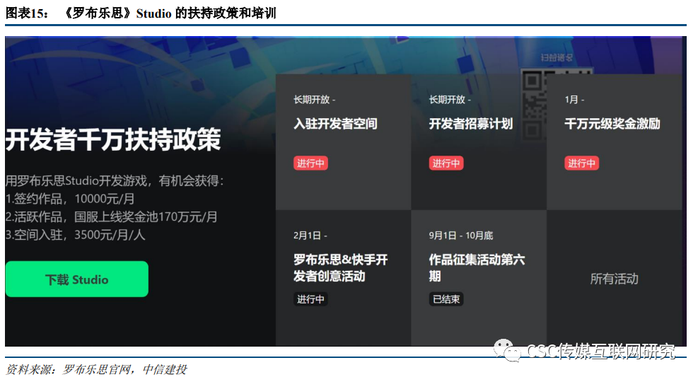 官方持续的大力扶持:《罗布乐思》不仅和游戏创作者分成一款游戏产生的收入,更推出了大量的创作者扶持计划。《罗布乐思》上线初期,签约作品即可获得10000/月的奖励,开发者入驻即获得3500元/月/人。从今年1月起,《罗布乐思》官方推出了千万级奖金激励,并与快手推出了开发者创意活动。优秀作品可以通过作品征集活动在《罗布乐思》APP获得推荐位的曝光,以此激发创作者热情。